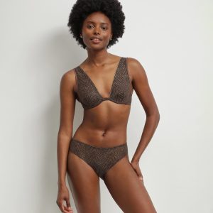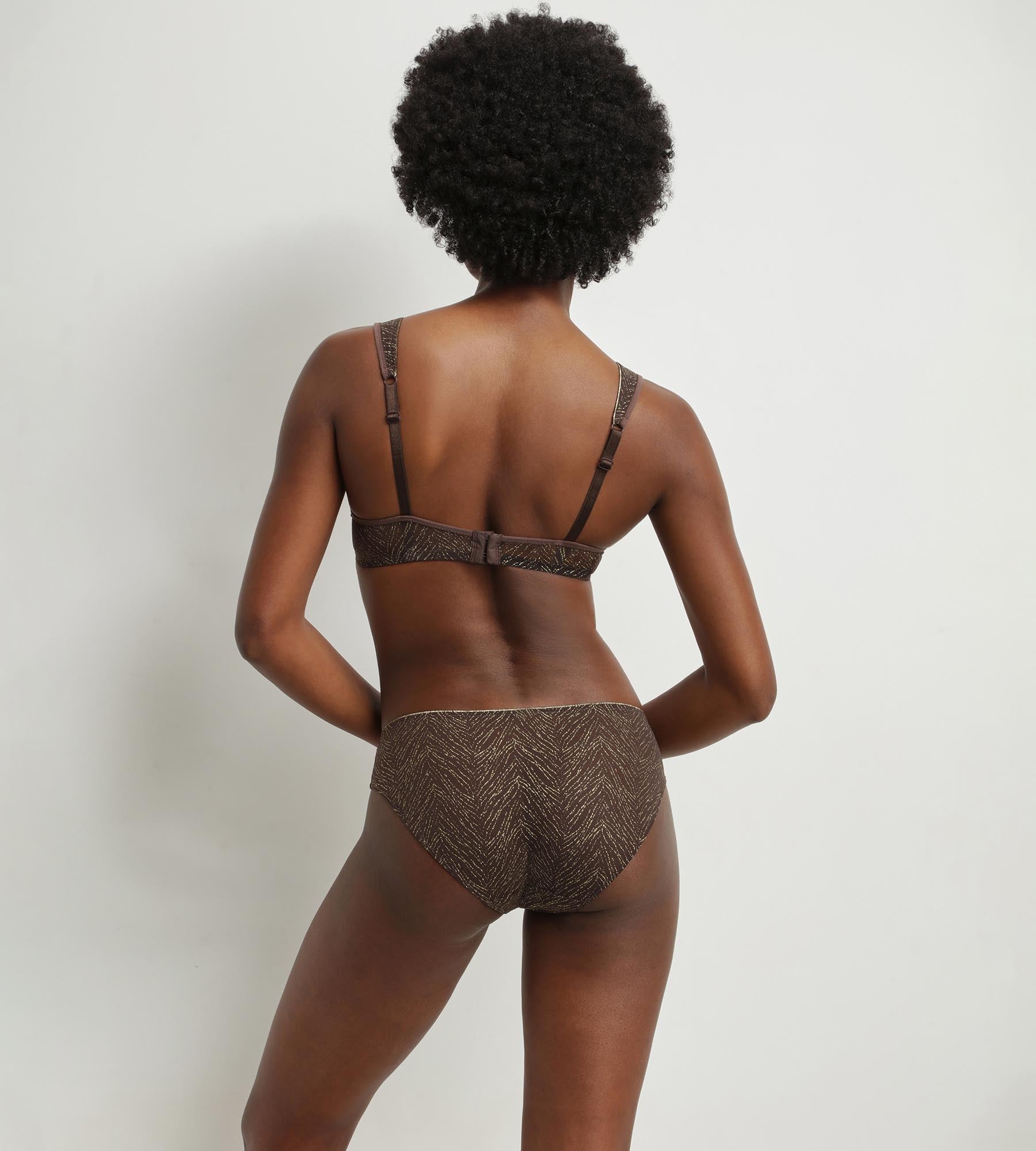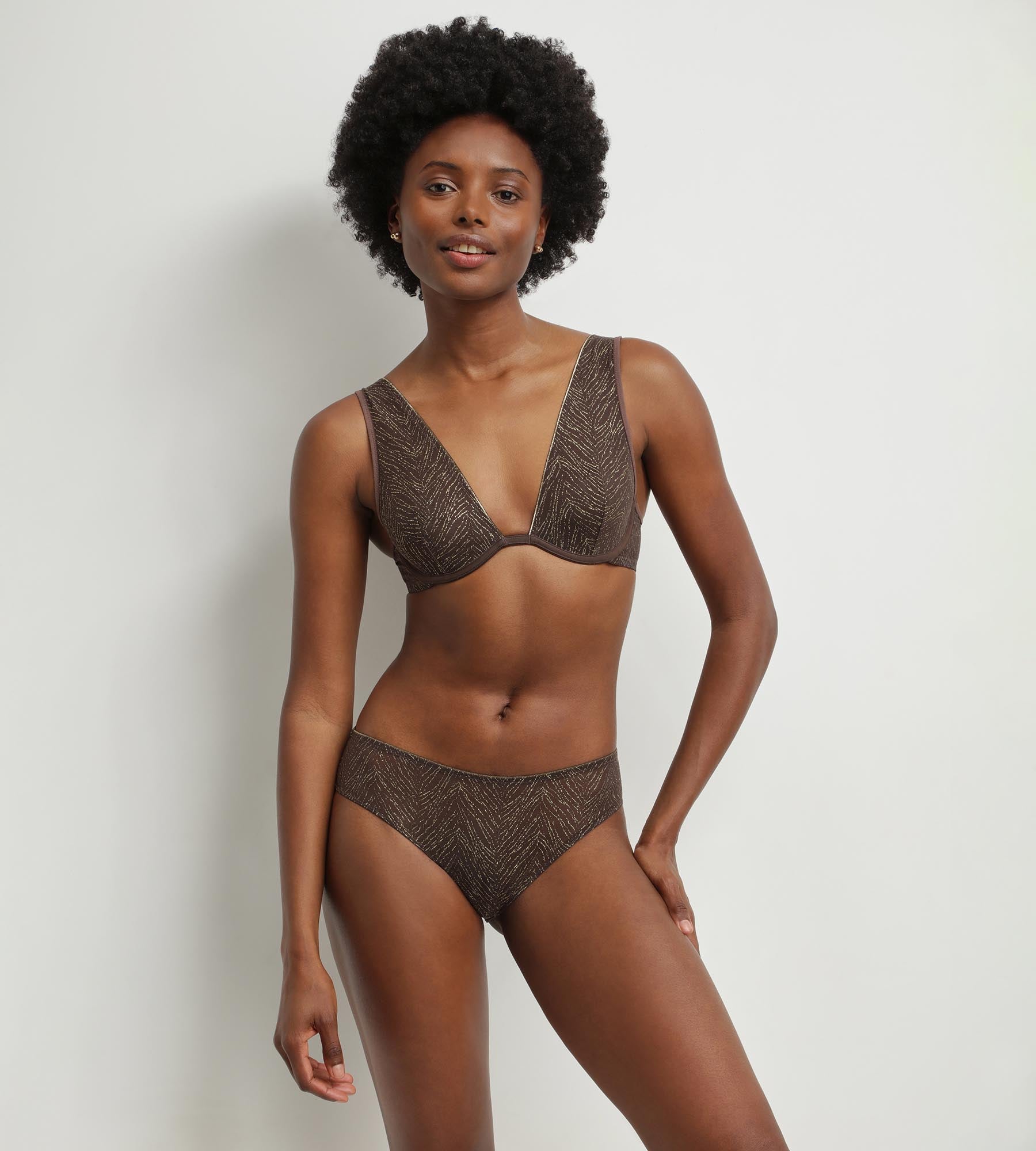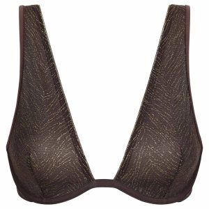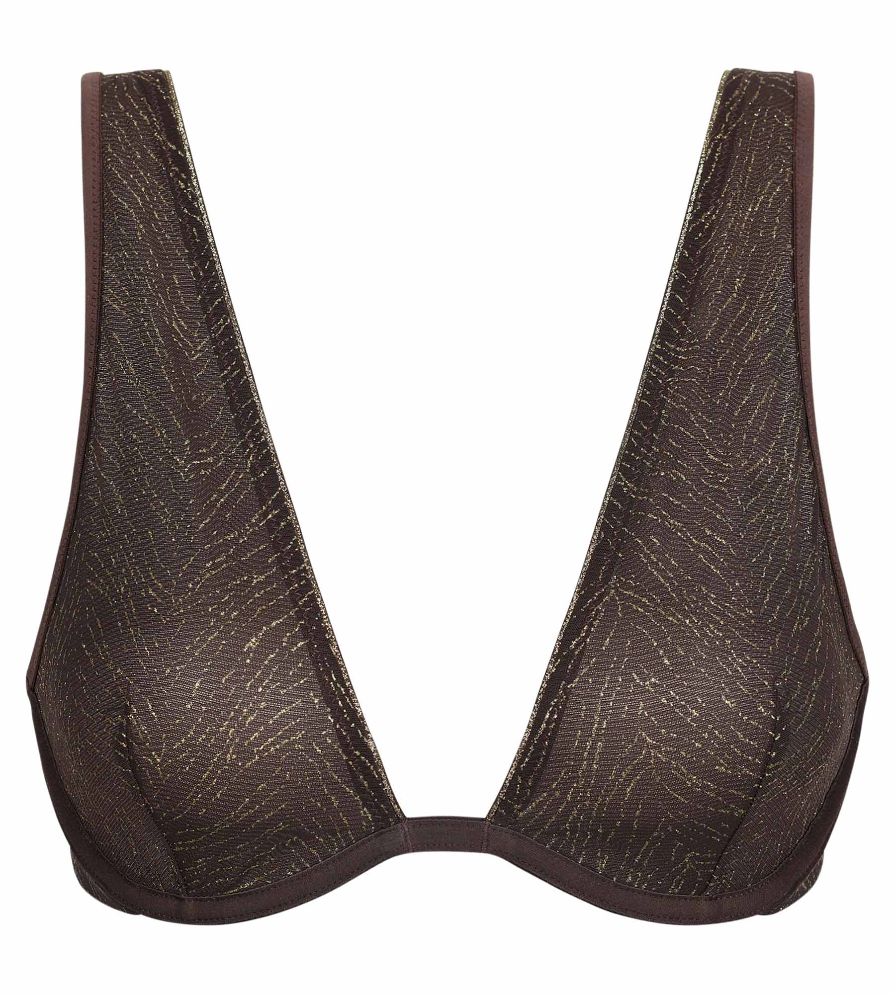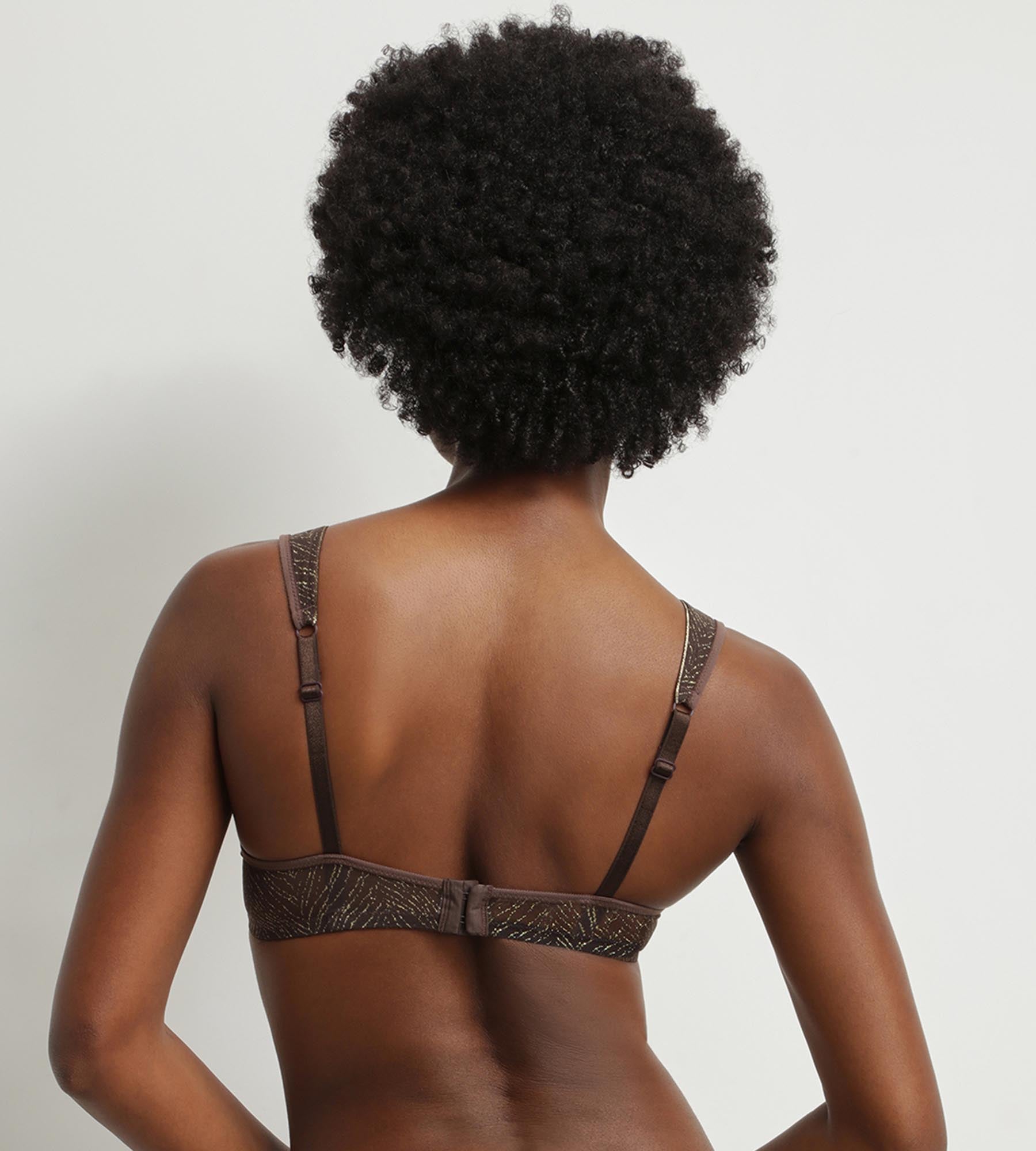 Highlight your décolleté with the Dim Generous Limited Edition scarf bra in Chocolate tulle with gold stripes!