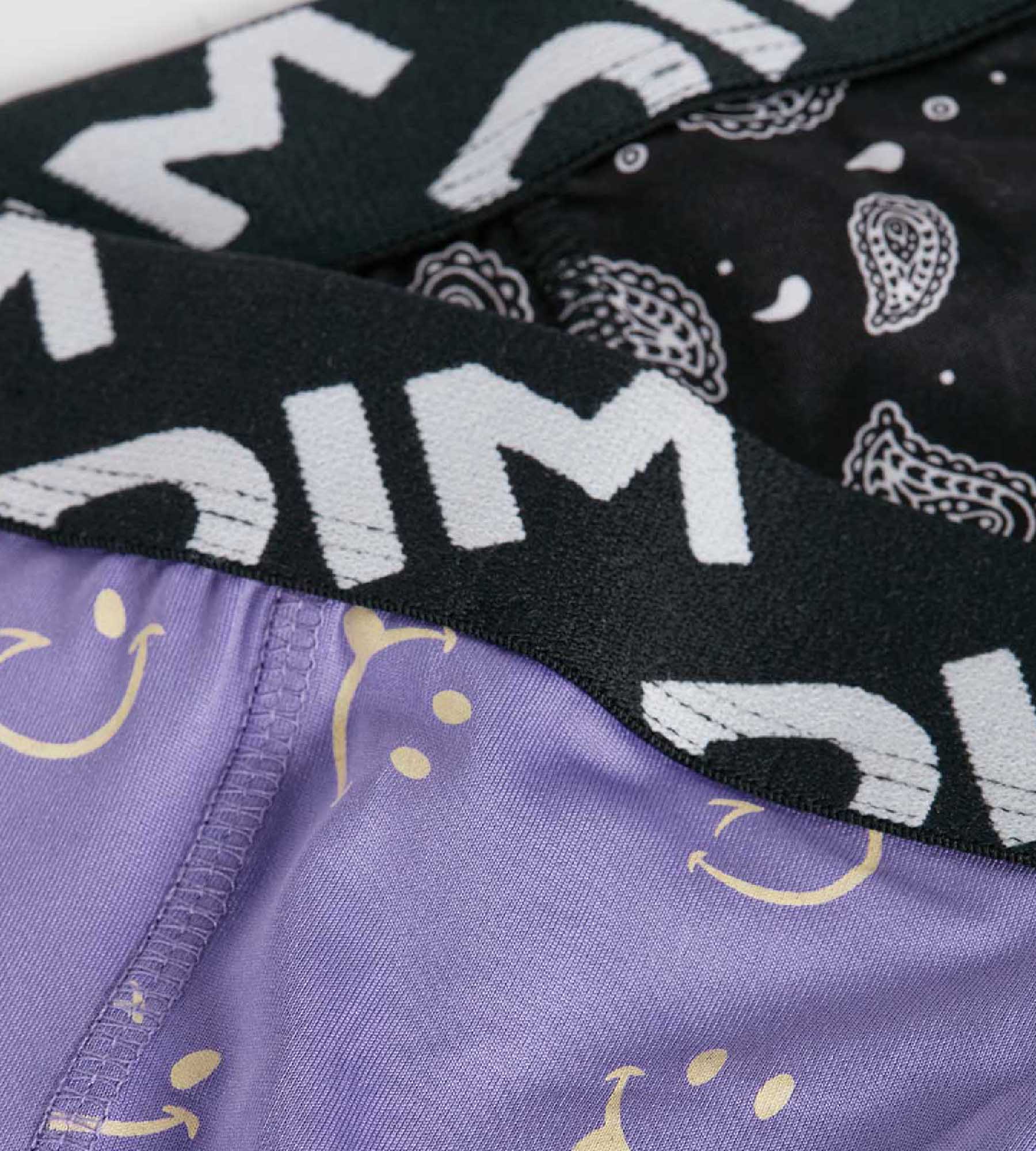 On one side, your boy puts on a black children’s boxer covered with the paisley pattern typical of bandanas, on the other, he slips into a mauve boy’s boxer covered with contrasting smileys, very fun! Mounted on a wide waistband with the Dim XL logo, its set of 2 Underwear for BoysDim Micro le maintains with comfort and charisma!
