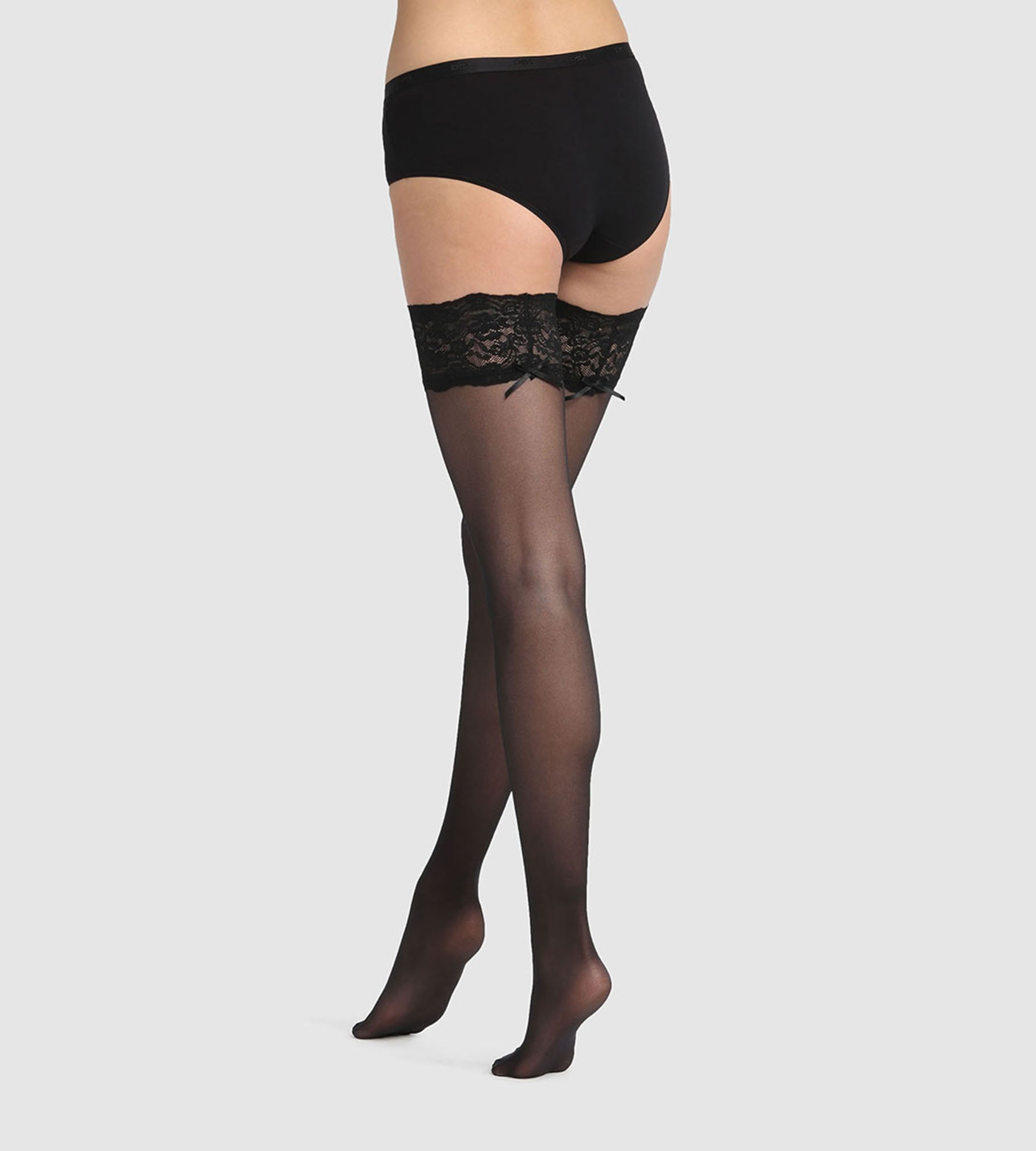 Bring out the big guns with the Dim Up Sexy 25D semi-opaque hold-up stockings with black lace garter!