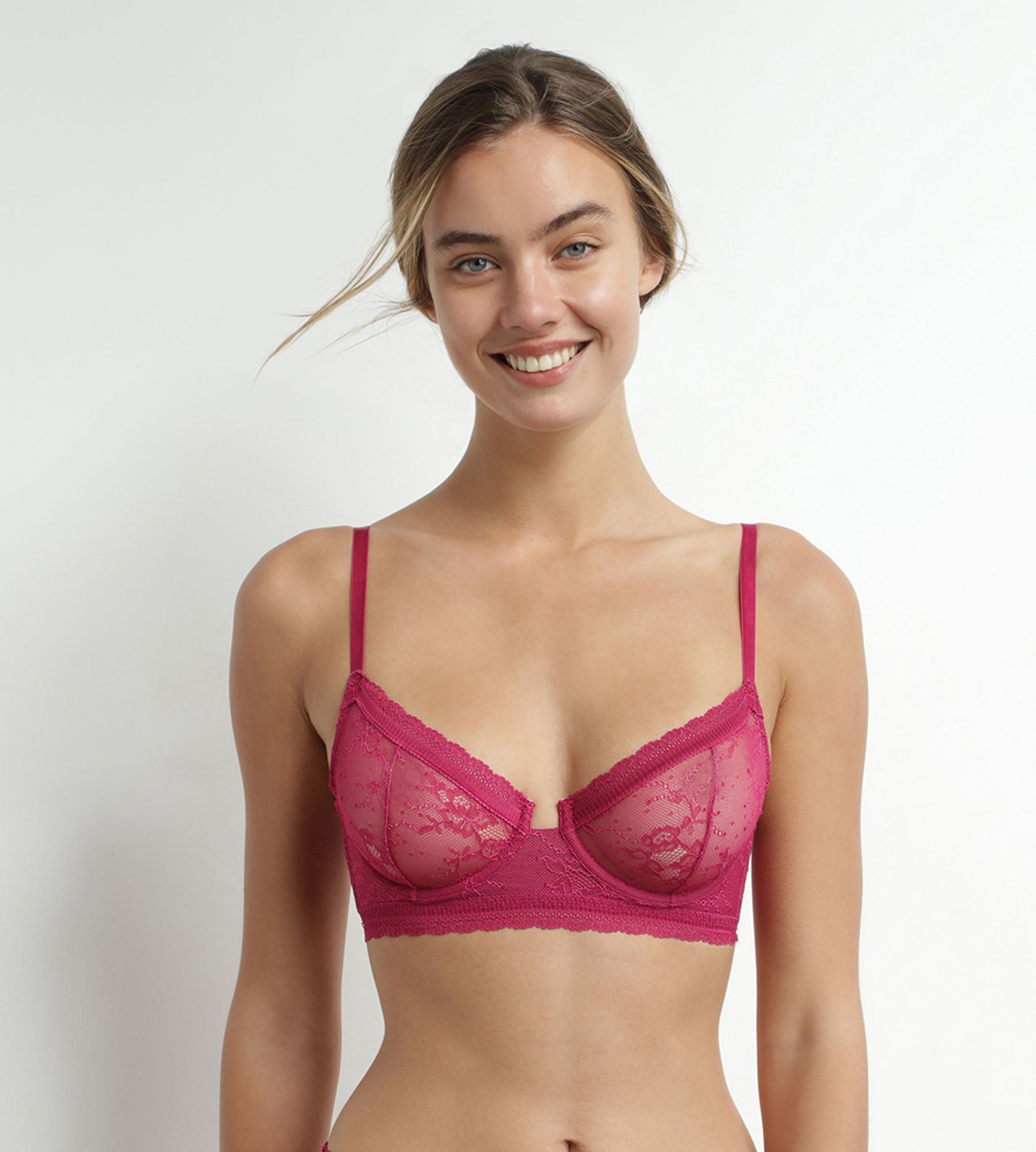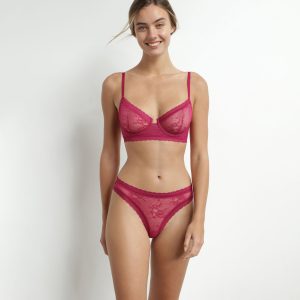 The Dim Romance interlocking bra in fuchsia lace and fishnet offers a sensation of lightness while enhancing the silhouette. Soft cups with round underwires naturally shape even the most generous breasts. With its wide, square-cup underbust elastic, the Dim lace bra offers reinforced support, while remaining distinguished. Delicate flowers and worked edges finish off this fuchsia bra with elegance.