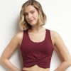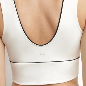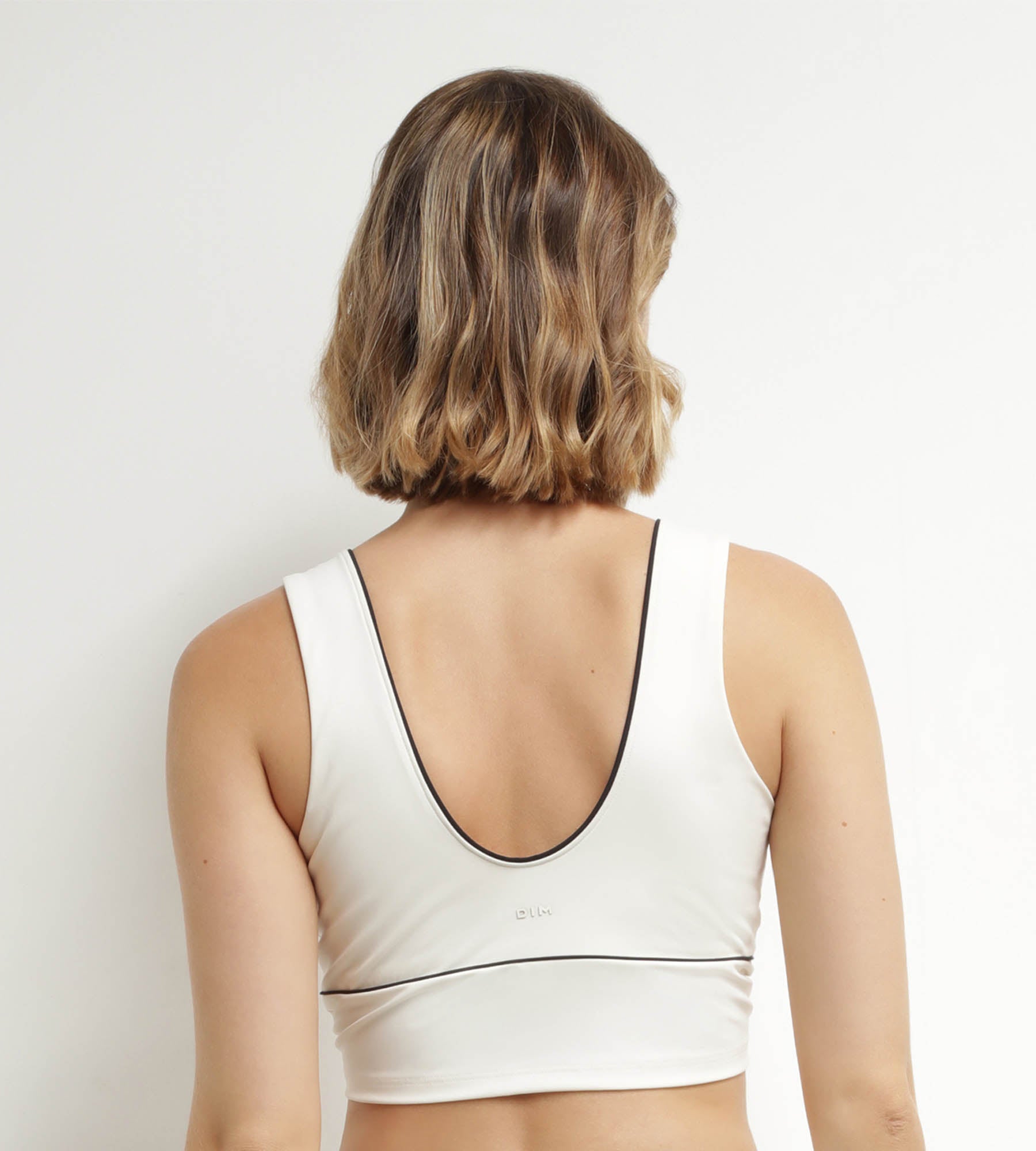 For style and performance, choose the Dim Move Ecru microfibre crop top with integrated bra!