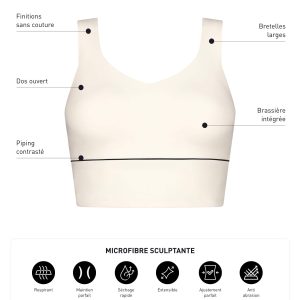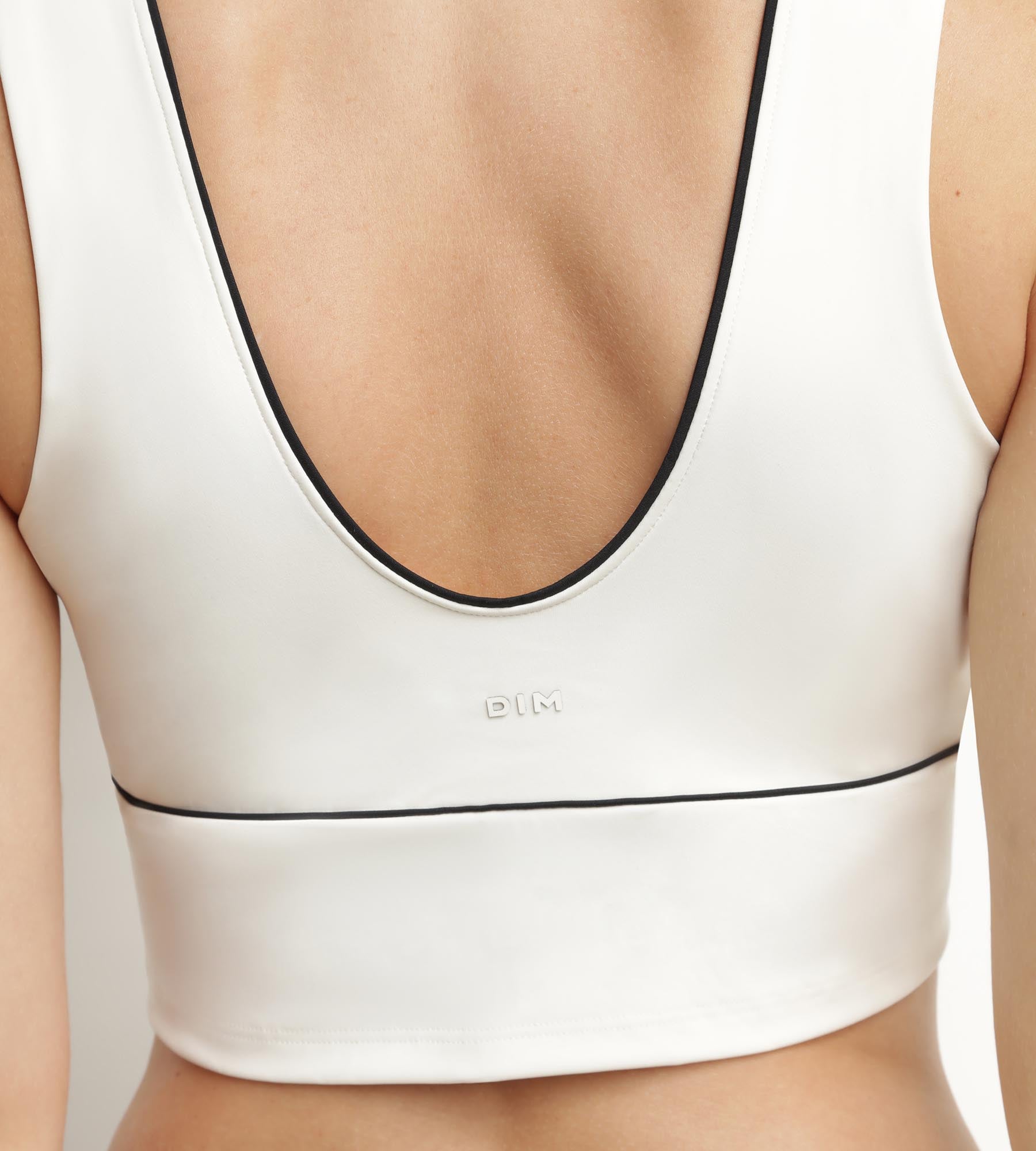 Thanks to its stretch microfibre, flat finish and integrated bra, the Dim Move crop top sculpts and supports your bust with ease. With its foam cups, V-neckline and open back, the sport bra Dim Move enhances the bust with femininity and preserves your mobility. Contrasting piping completes you vêtement de sport avec dynamisme.