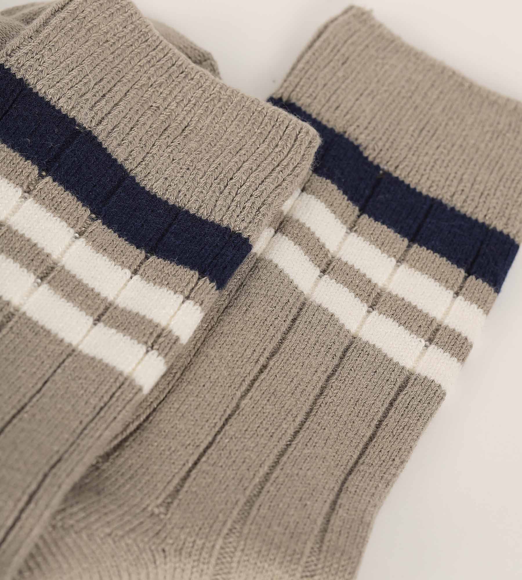 Made from ultra-cozy natural cellulose fibres, with elastic finishes and a ribbed knit, the men’s warm socks Dim Bamboo elevates your style with comfort and elegance. We love the more athletic version of these men’s cotton socks Sand grey, with wide navy and white stripes: your look is dynamic, trendy and well-groomed.