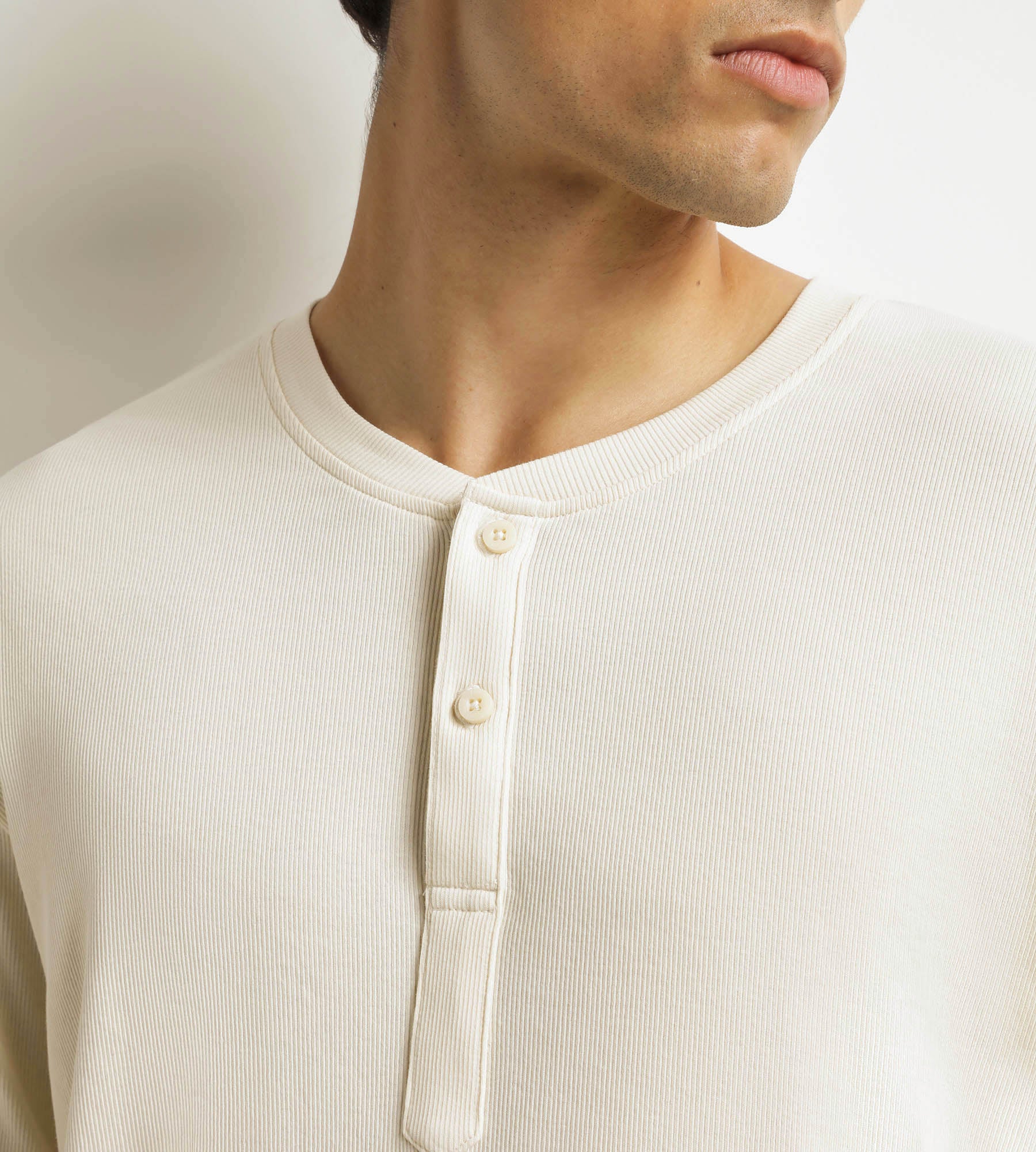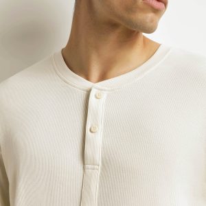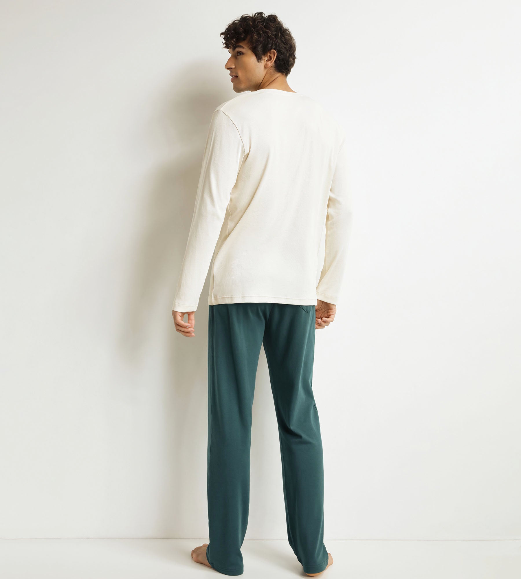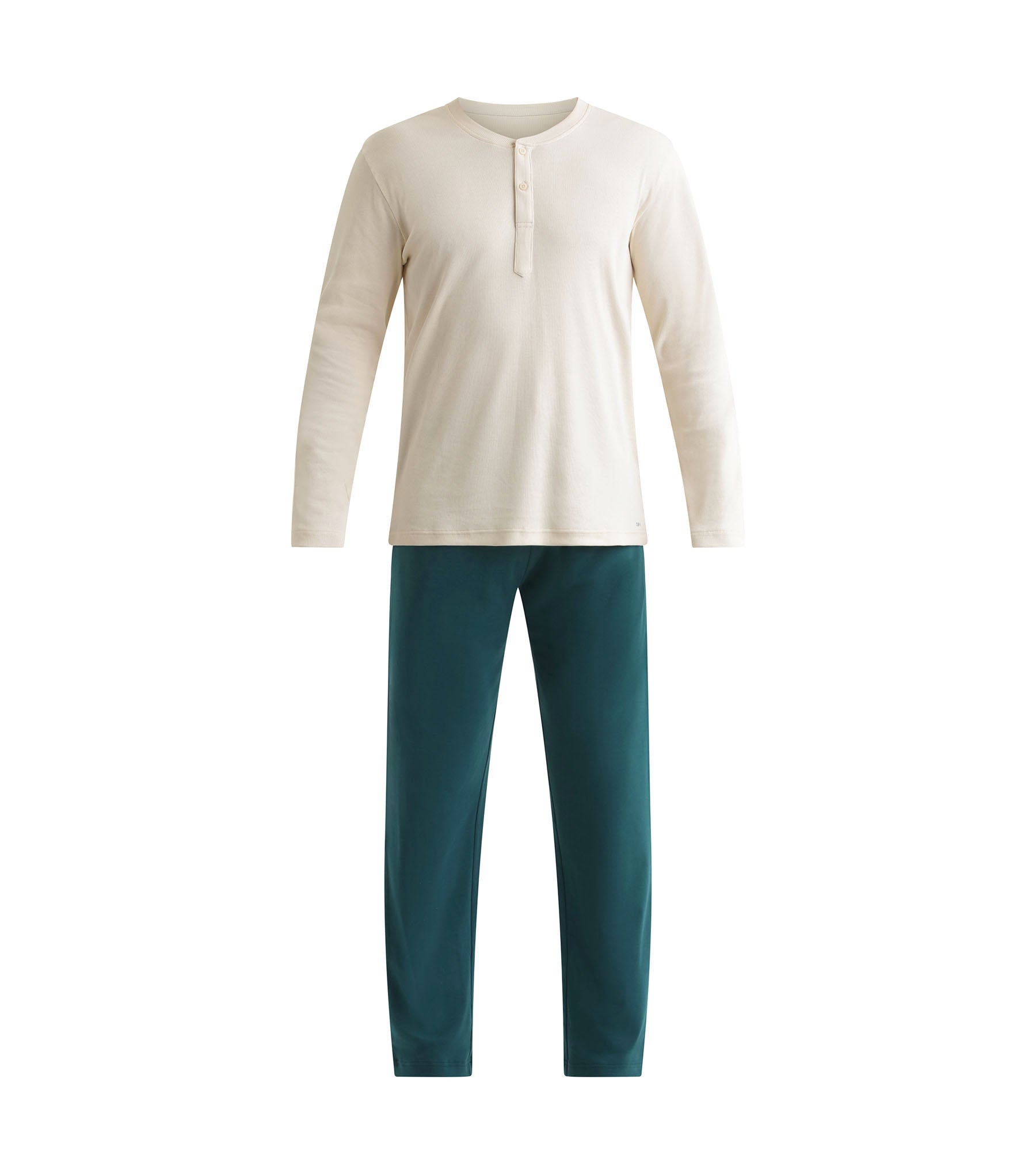 Composed of a long-sleeved top in lightweight ribbed jersey and straight trousers in a thicker knit, this Dim Warm men’s pyjama set combines warmth and elegance. The serafino collar is easy to slip on and has contrasting buttons for a neat finish. The understated colours – ivory and deep green – are modern and versatile, for a loungewear set that can be worn day or night.