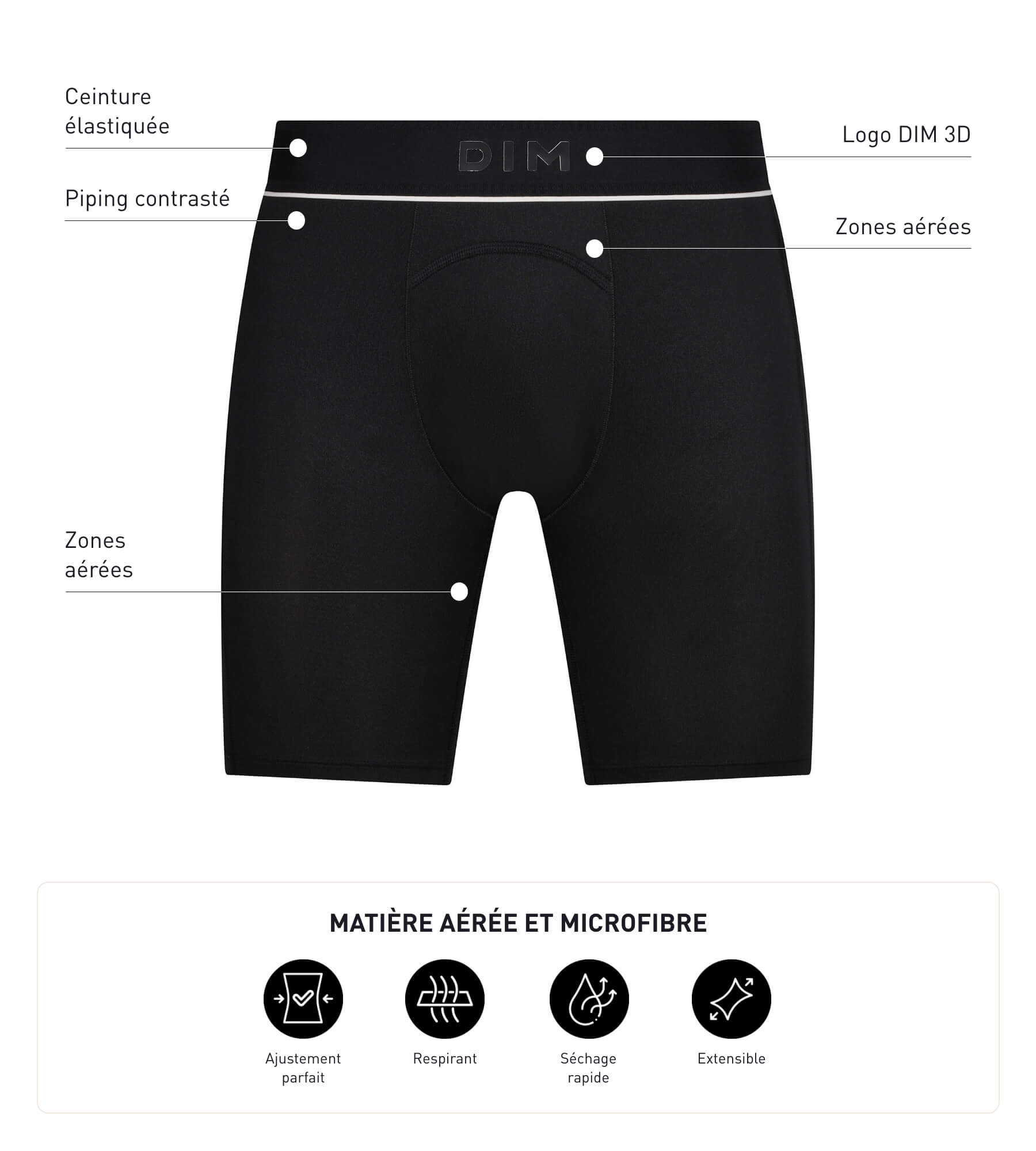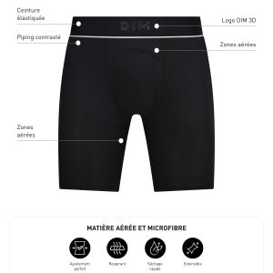 Adopt the versatile, technical design of the Dim Move Black Men’s Long Boxer Brief, which can be worn on its own or under your sportswear! Made from stretch microfibre with a lining at the front, the boxer briefs men’s sports Shapes and supports your body to perfection, like a second skin. With ventilation zones in the crotch and back, this Dim Move sportswear guarantees a cool feeling throughout your activity.