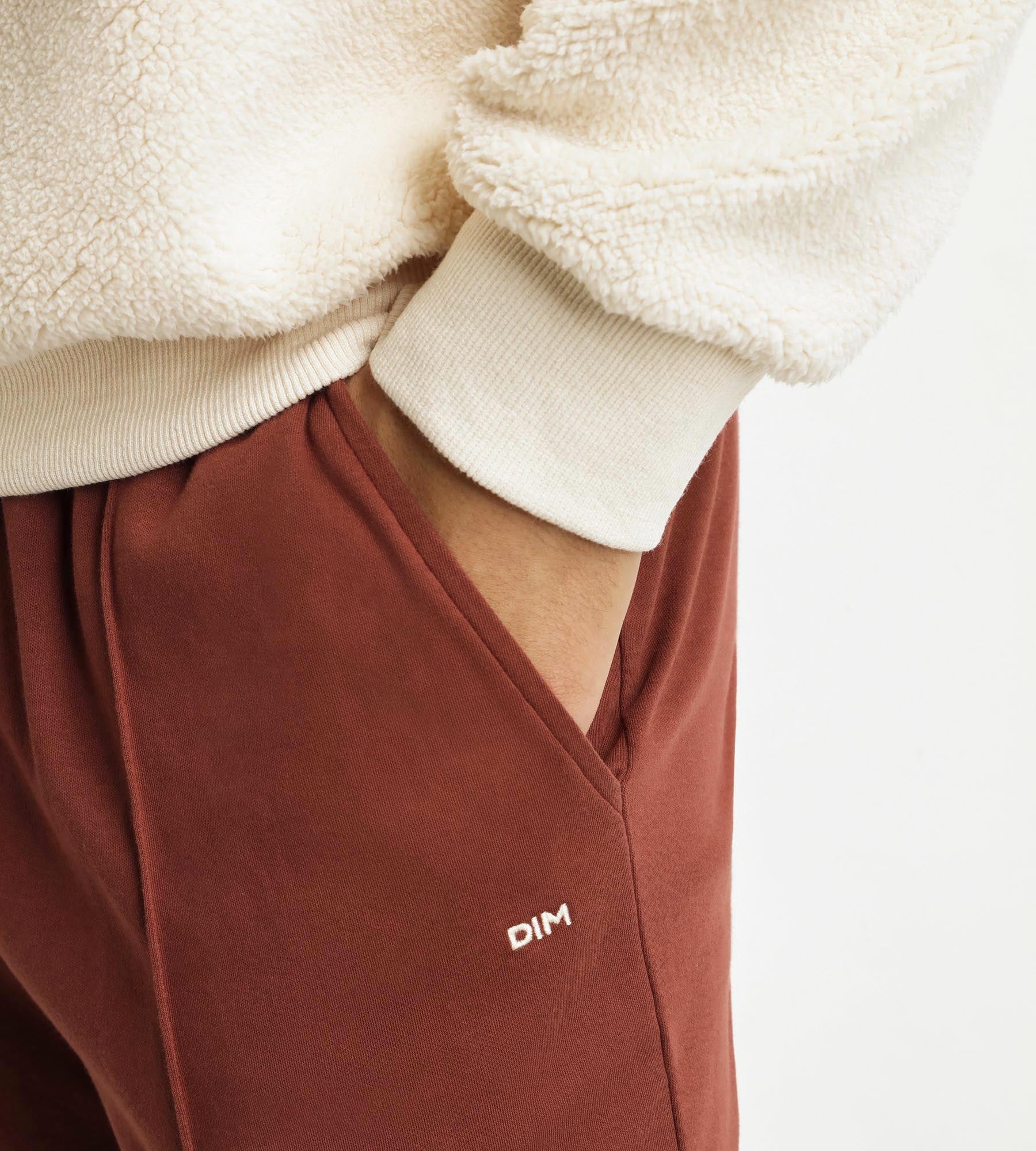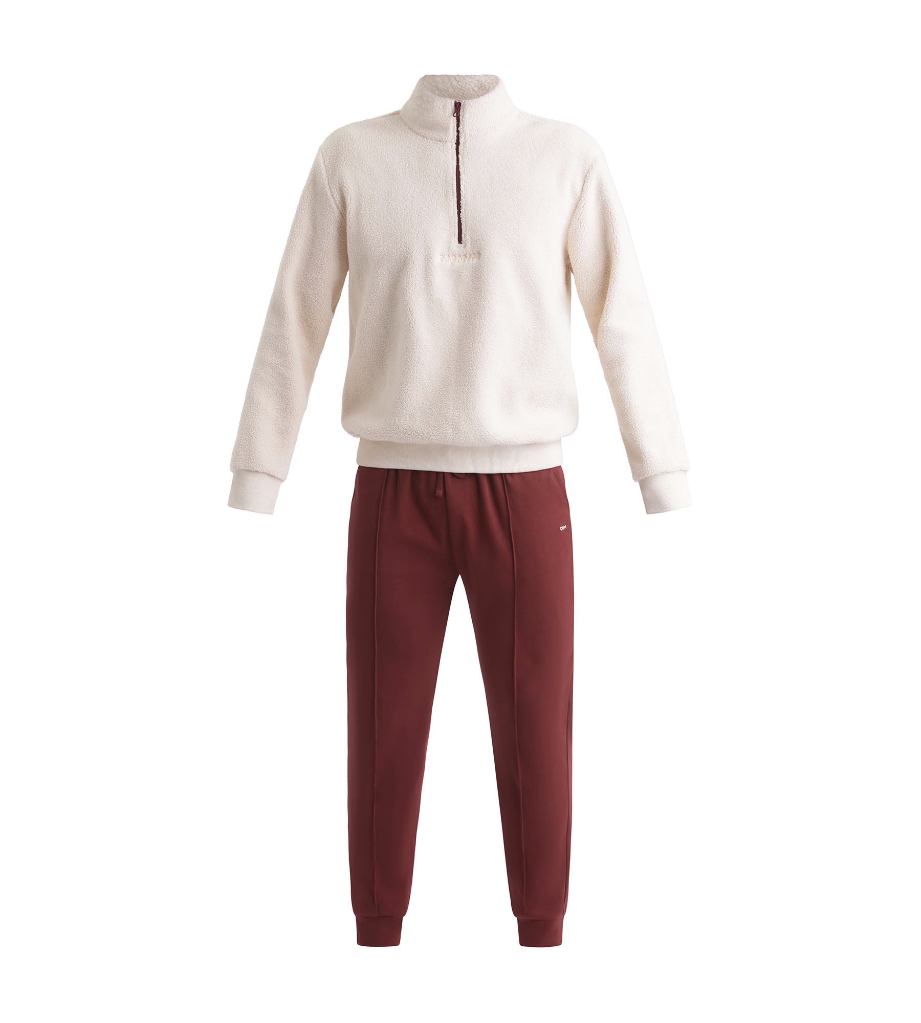 These Dim men’s pyjamas combine a soft, warm wool-effect knit with a modern, relaxed fit. The top, with a high zip collar and thick ribbing, insulates against the cold while emphasising the build. The classic jogger trousers have two pleats at the front for added structure. With a stretch waistband, these pyjamas fit and move perfectly with you. The discreet embroidery on the top adds a sober, urban finishing touch.