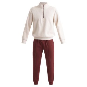 For a cosy, urban style, opt for Dim’s men’s trouser pyjamas in ivory and burgundy lambswool effect.
