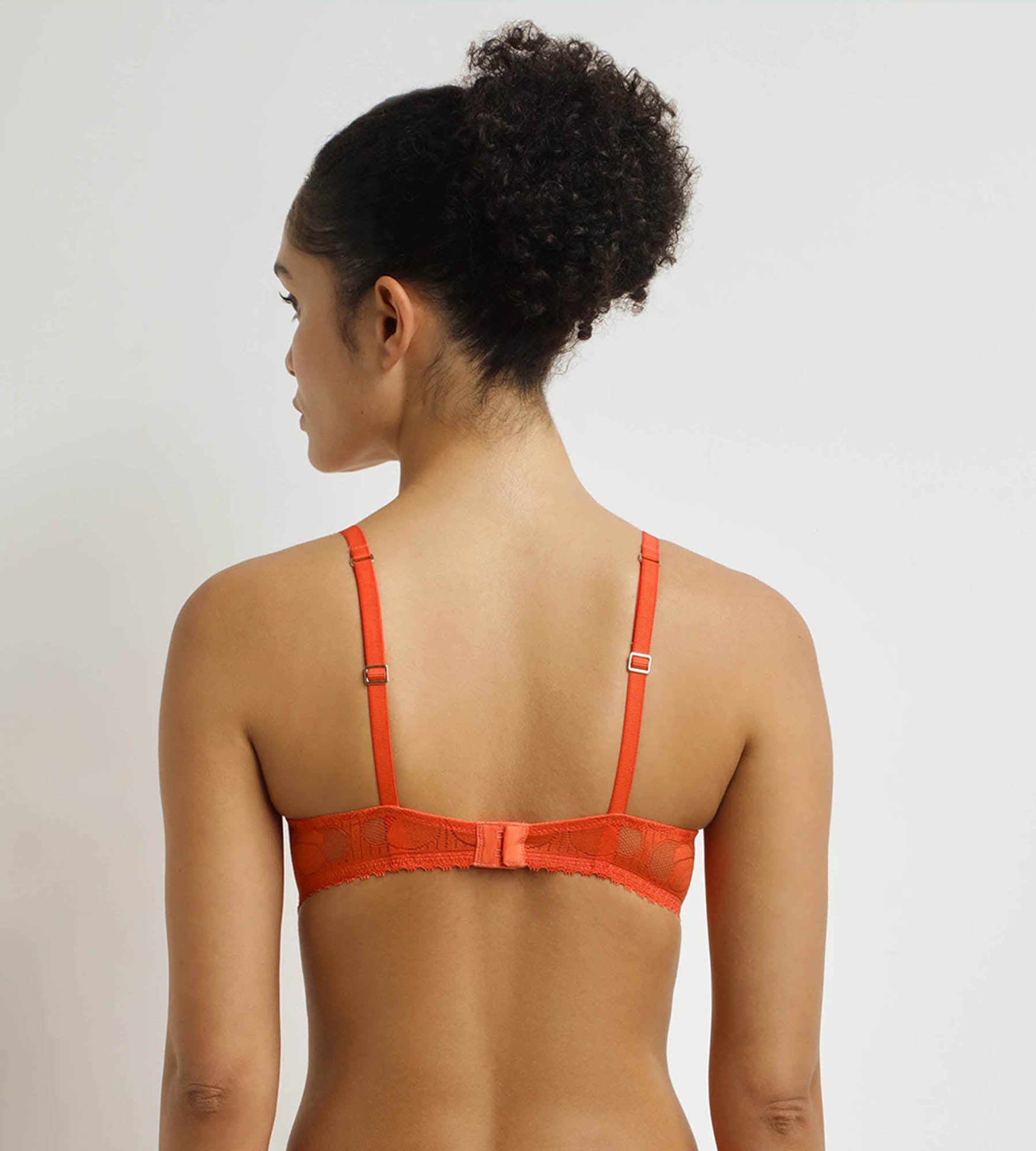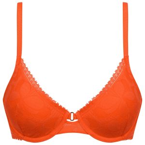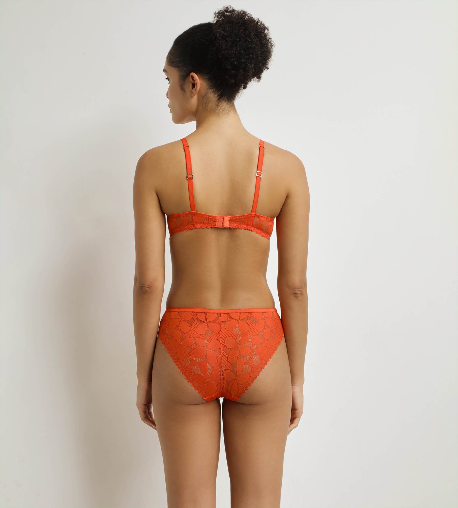 Show off a vibrant look with the Orange Dim Art Flower corbeille bra. Thanks to its moulded cups with integrated foam, it naturally draws and rounds the bust while offering real comfort. Its floral lace plays with transparency to enhance the neckline without weighing down the silhouette. This underwired bra with golden details combines support and femininity in a modern, graphic spirit.