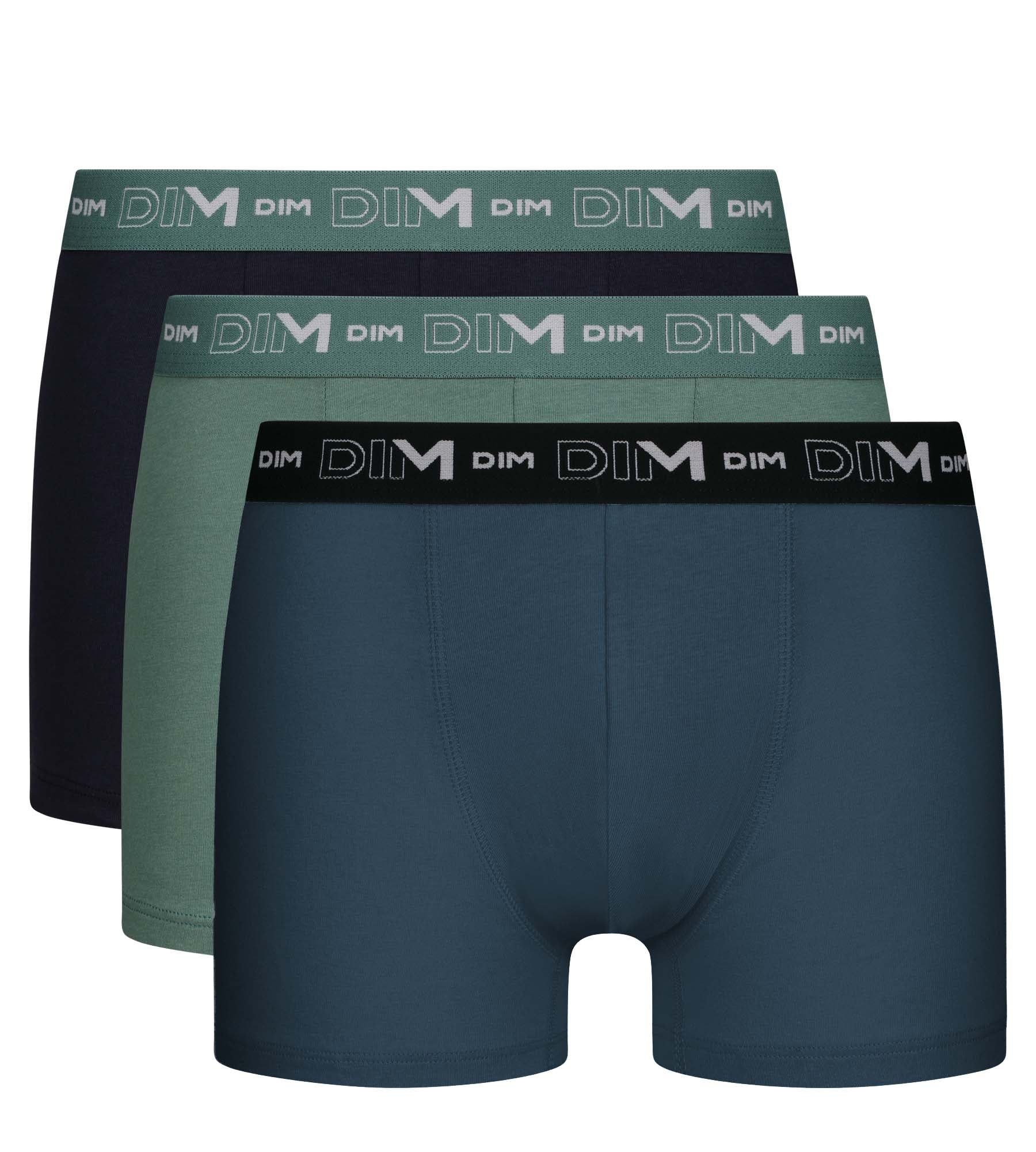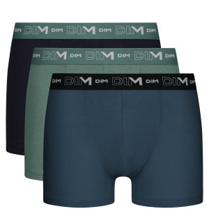 For a fresh, elegant look, choose the Dim Coton Stretch 3-pack of men’s boxers in Black, Almond Green and Peacock Blue!