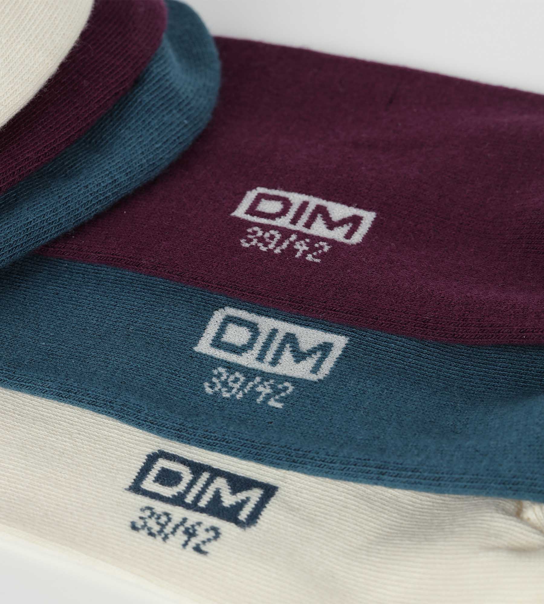 Opt for a stylish and comfortable look with the 3-pack of Dim men’s socks in duck blue, purple and cream cotton!