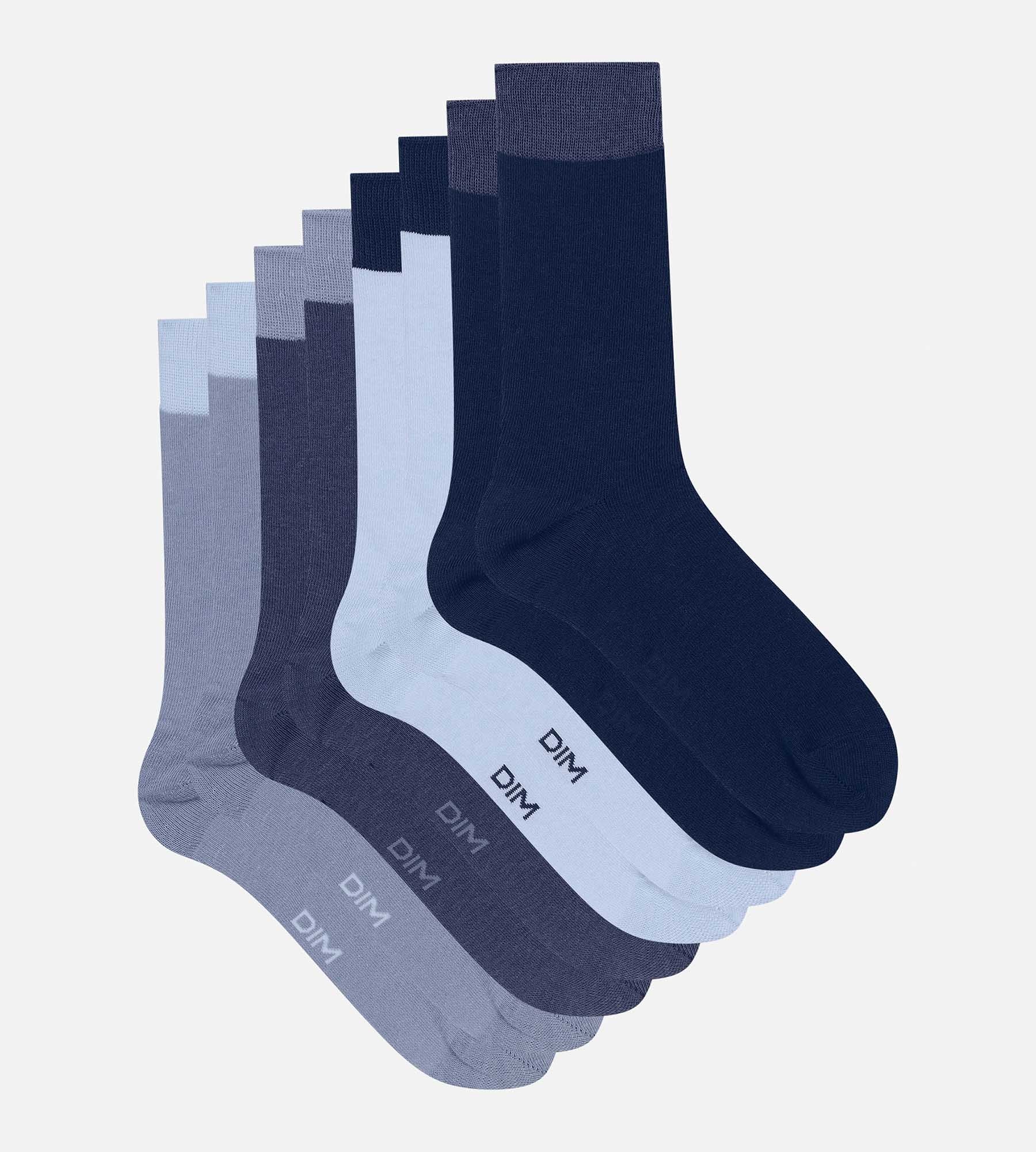 Composed of four plain pairs in a blue gradient, highlighted by a contrasting hemline, this pack of EcoDim Mode men’s cotton socks adds a discreet touch of style. The cotton blend knit is soft and comfortable, and lets feet breathe naturally. The mid-rise cut fits over most shoes and complements your trousers with understated style. With their lined ends, EcoDim Mode socks ensure good wear over time.