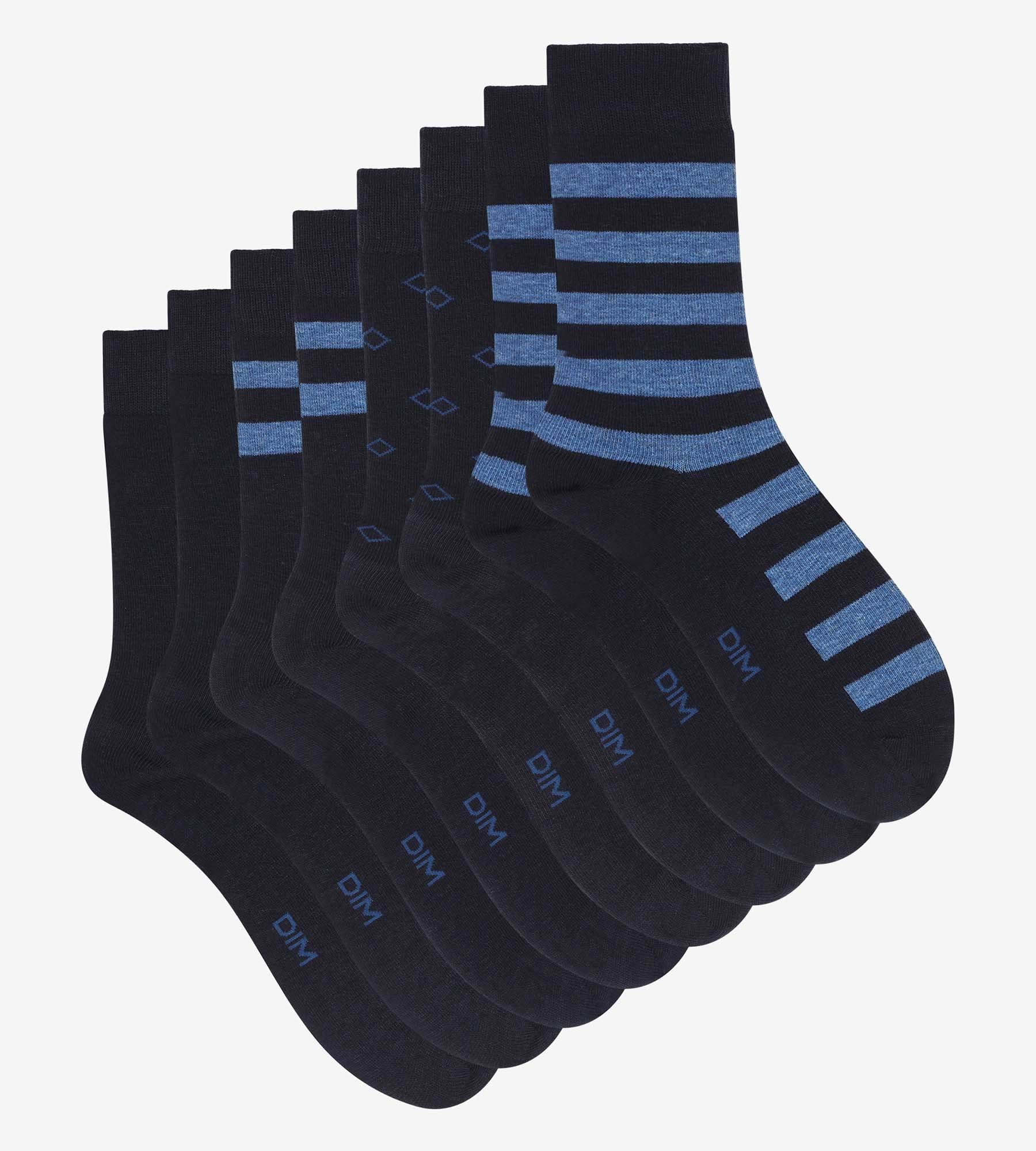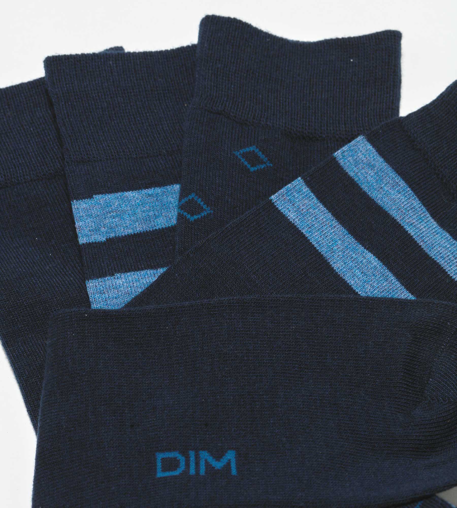Made up of 2 pairs of striped socks, one pair of plain men’s socks and a pair punctuated with diamonds, the pack of 4 EcoDim men’s cotton socks allows you to vary the styles with style! Thanks to its polyester/cotton/elastane composition and its elastic finishes, your Navy men’s fancy socks dry quickly and are very comfortable!