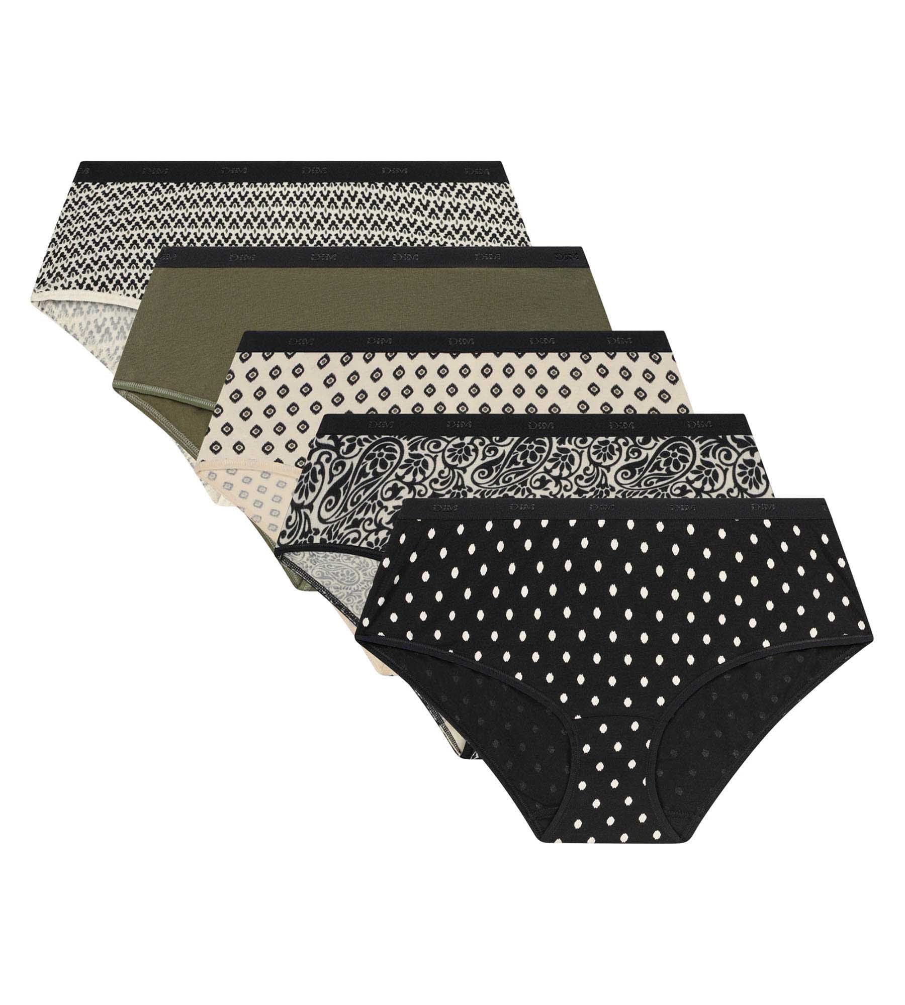 Pack of 5 black khaki ethnic pattern boxer shorts for women Les Pockets