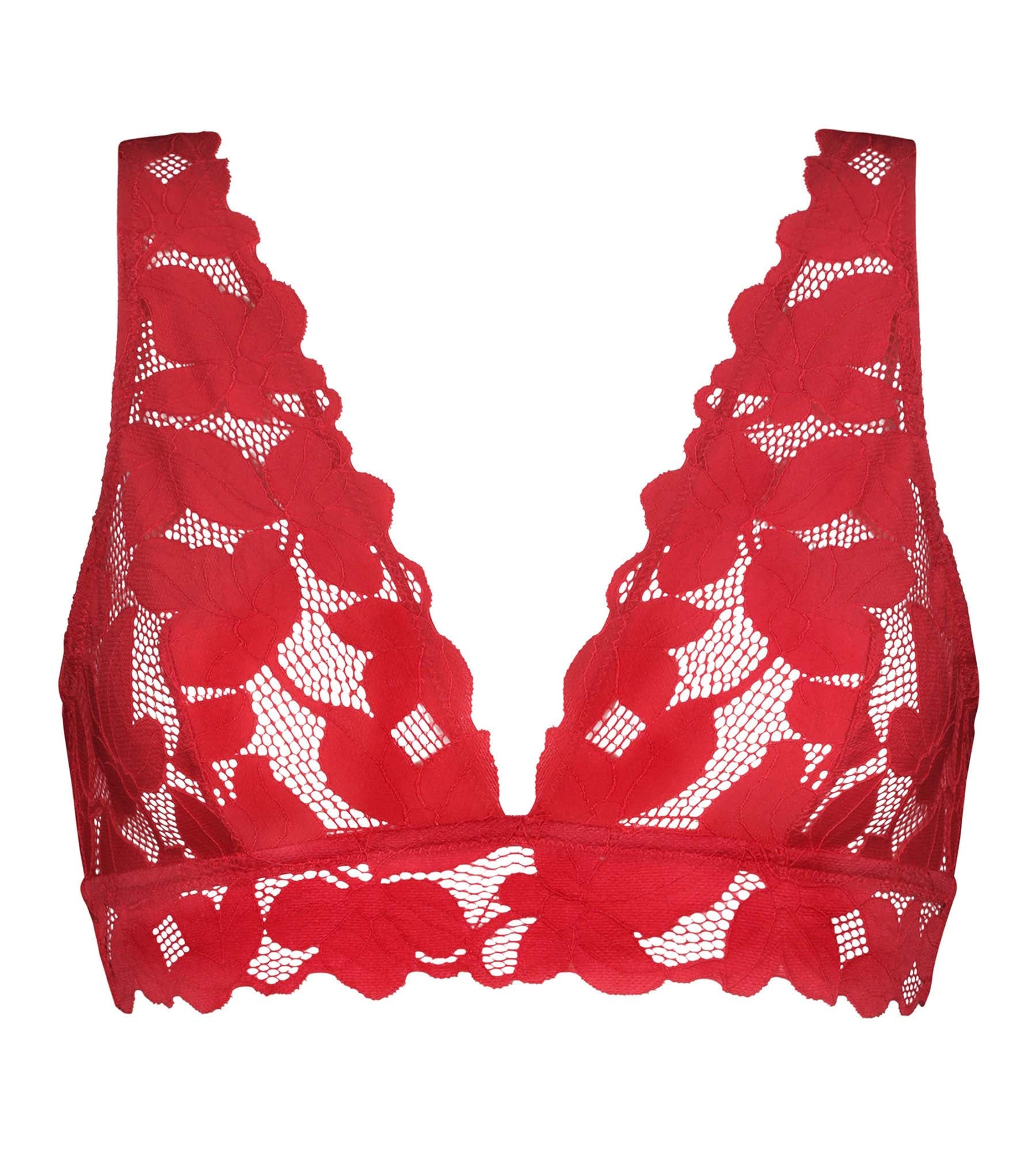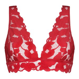 Reveal your femininity with the Dim Lacy triangle bra in floral lace and Red fishnet!