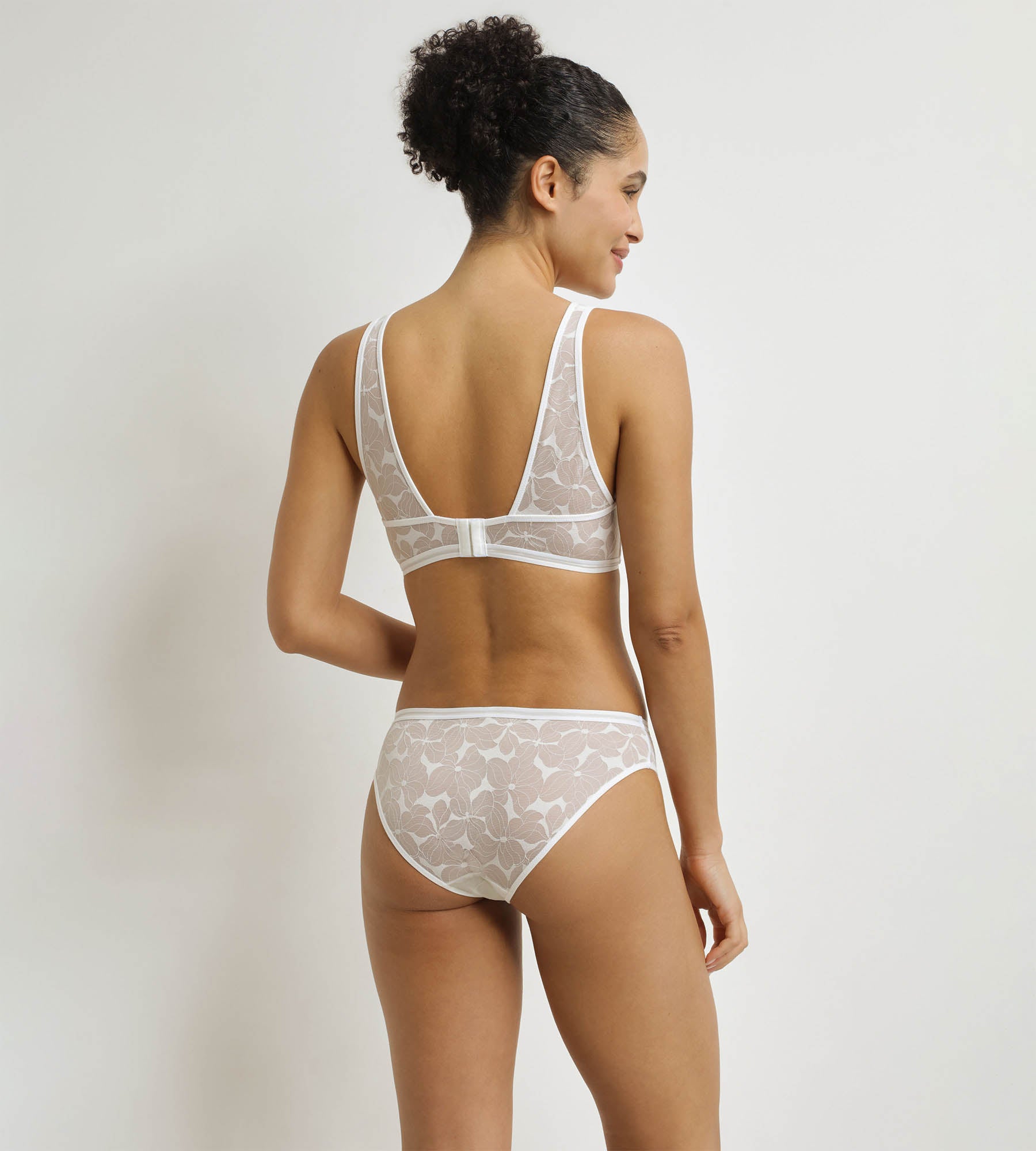 Lightweight and comfortable, the Dim Bloom White underwired bra dresses up your figure with an enchanting floral pattern. Its scarf cut with soft cups rounds out and smoothes the bust, with no compression effect. The wide elastic band and U-shaped back stabilise this women’s bra while guaranteeing total freedom of movement. With its opaque and translucent flowers and contrasting saddle hem, this Dim Bloom lace bra is ultra-feminine.
