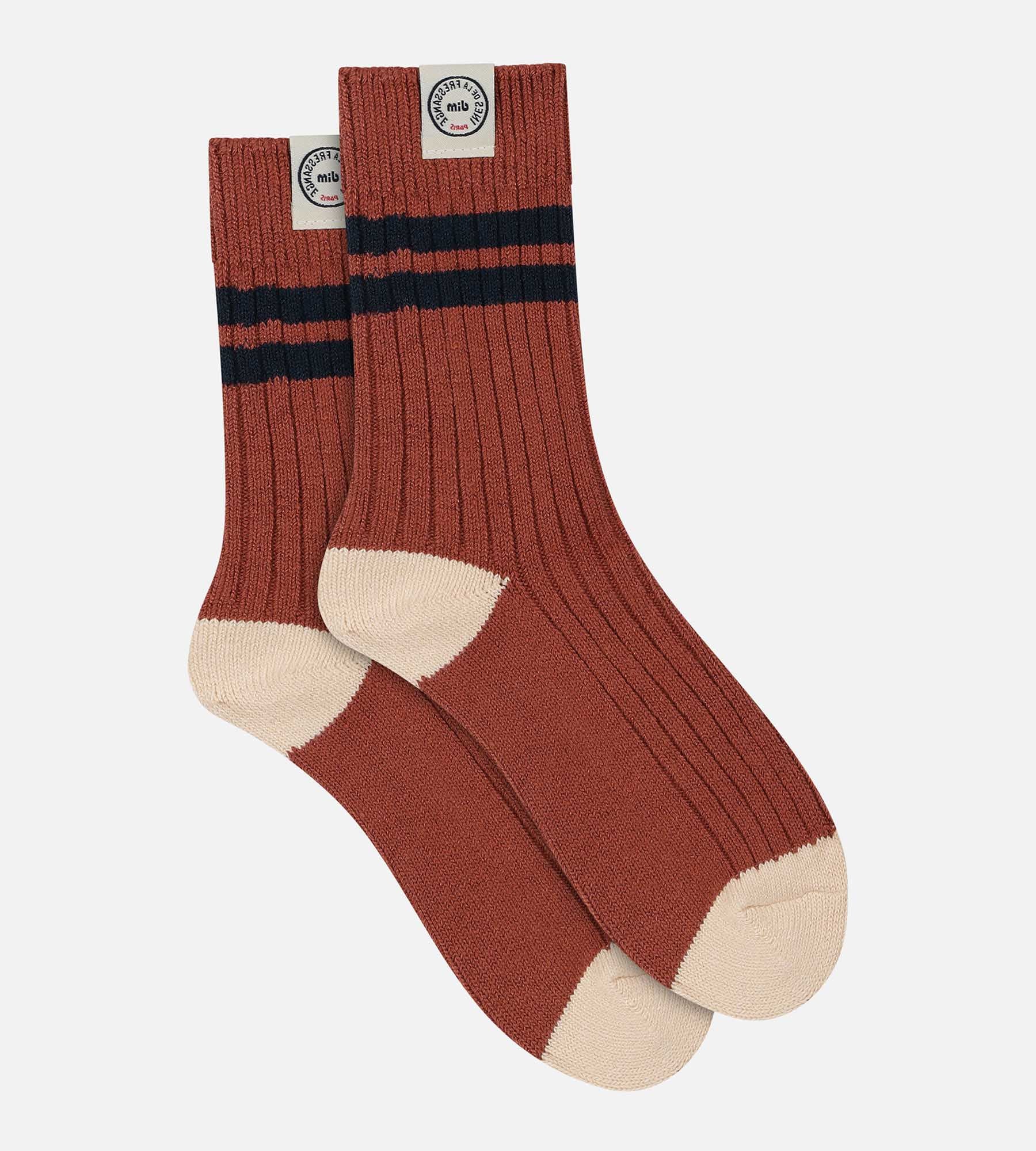 The Dim x Inès de La Fressange women’s fancy socks in Redwood Brown offer a good balance between classicism and originality. Bamboo viscose brings suppleness and colour intensity, while ensuring optimal everyday comfort. With its brown colour, beige accents on the heels and toes and dark blue stripes, this pair revisits sporty style with finesse. An accessory to pair easily with light jeans, a pencil skirt or Bermuda shorts.