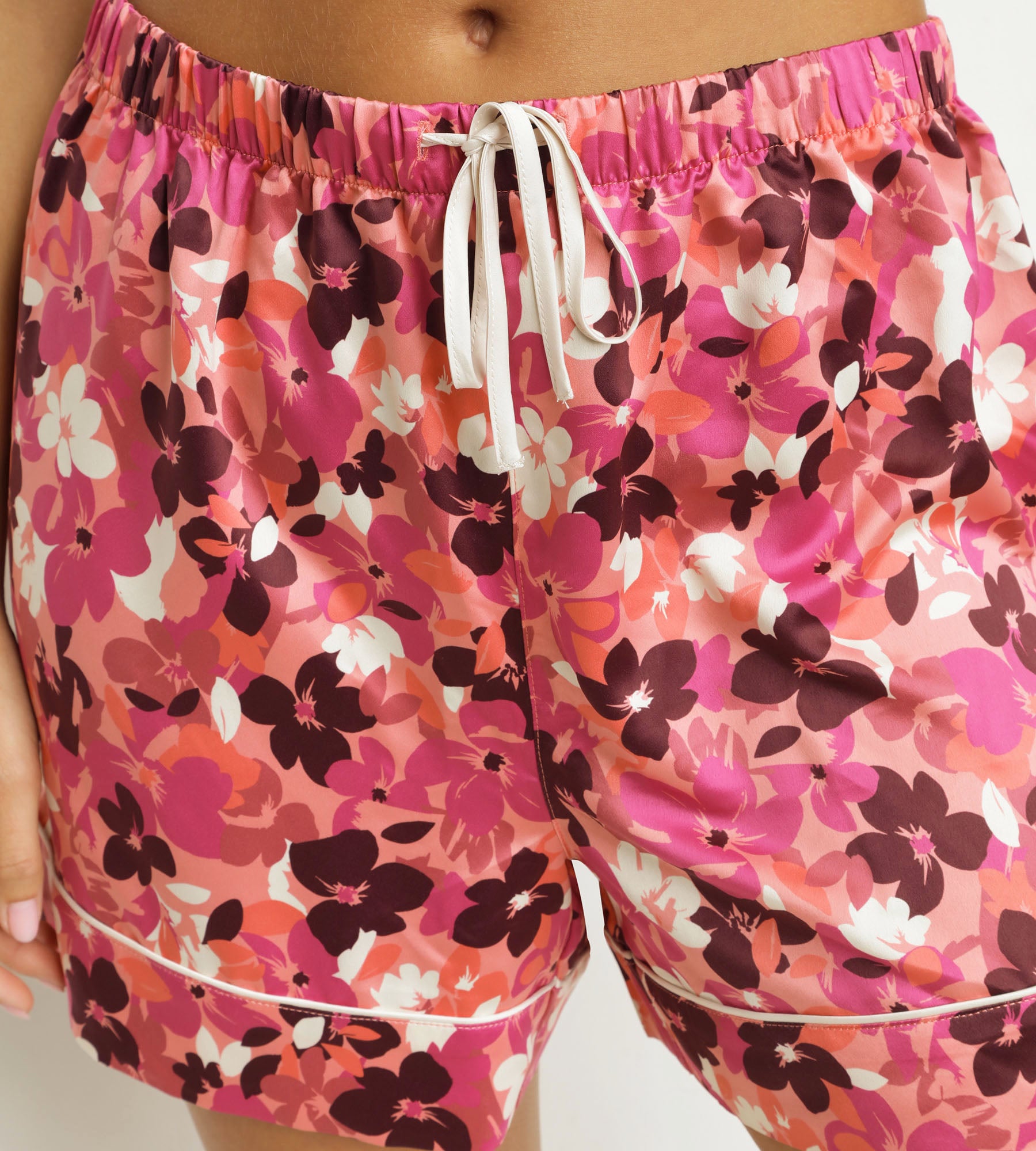 Stay stylish even at night with the Dim Don’t Disturb floral fig satin shorts.