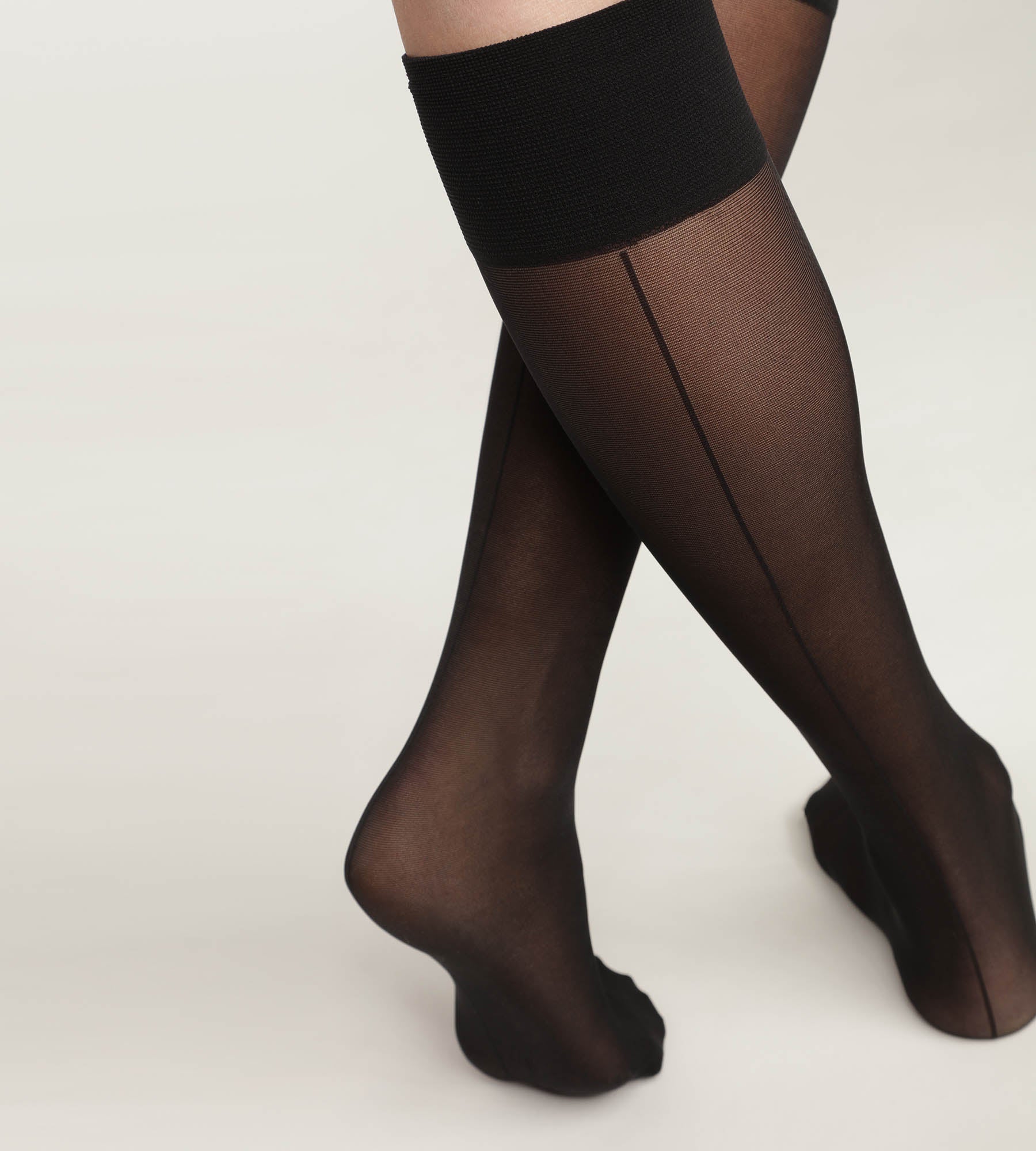 Fall for the couture style of Dim Style’s Black voile knee-highs with elegant vertical piping.