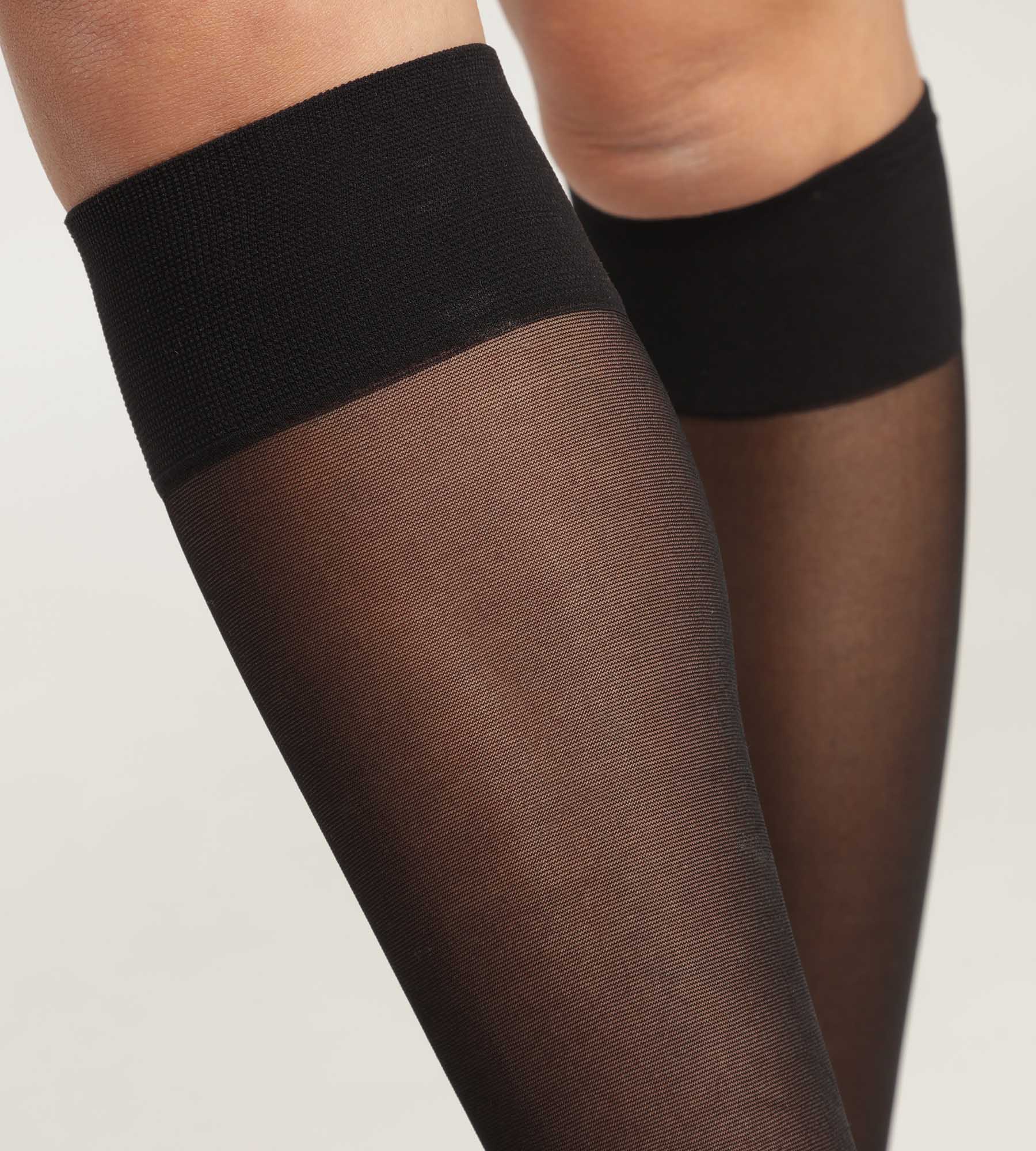 Practical and sophisticated, Dim Style women’s knee-highs in sheer black voile slip discreetly and comfortably under 7/8ths pants and long dresses. Thanks to the contrasting piping at the back of the calf, Dim Style black knee-highs add a polished visual touch to your look.