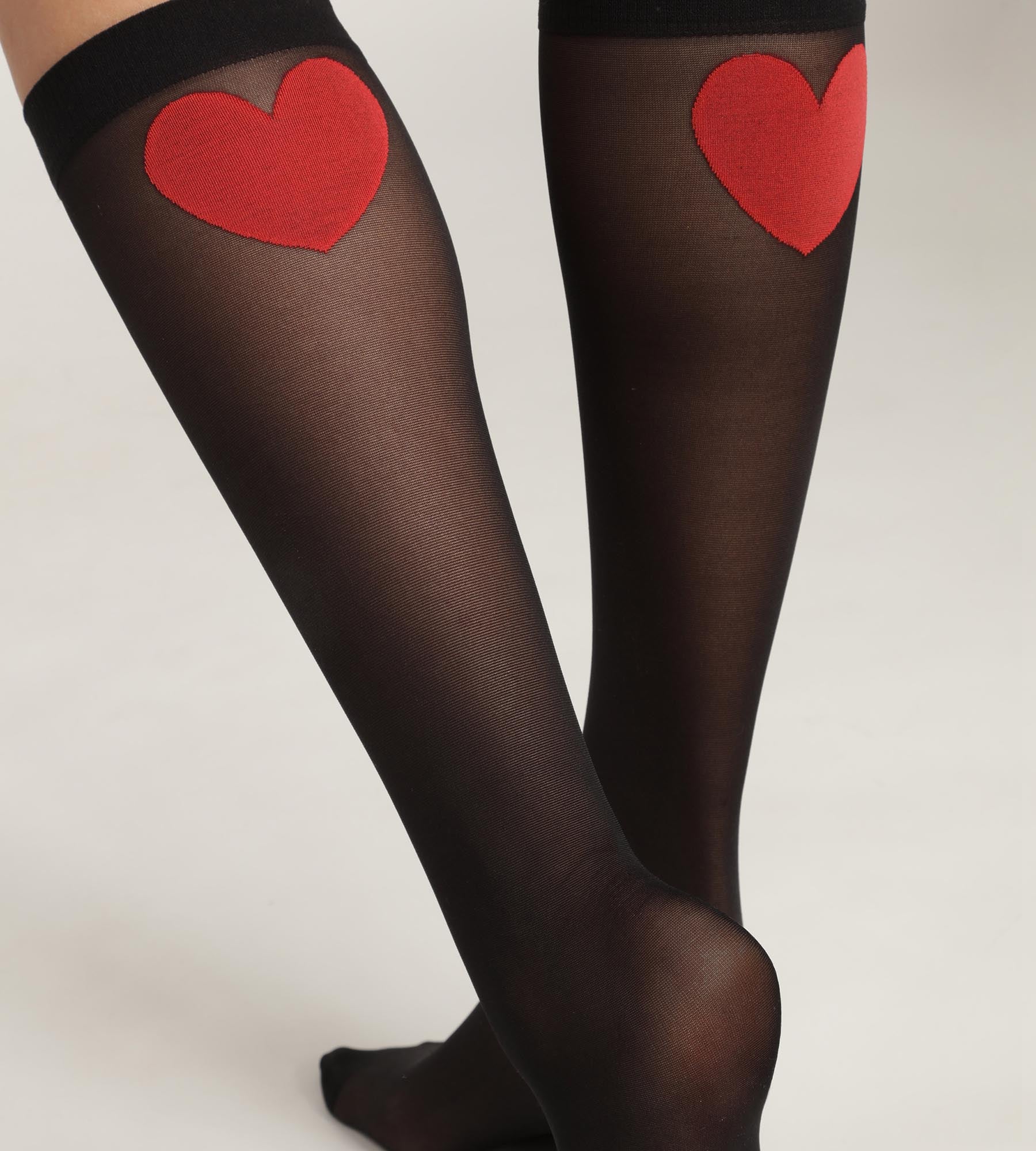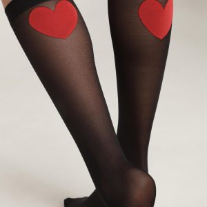 Women’s knee-highs in sheer black voile with red heart Dim Style