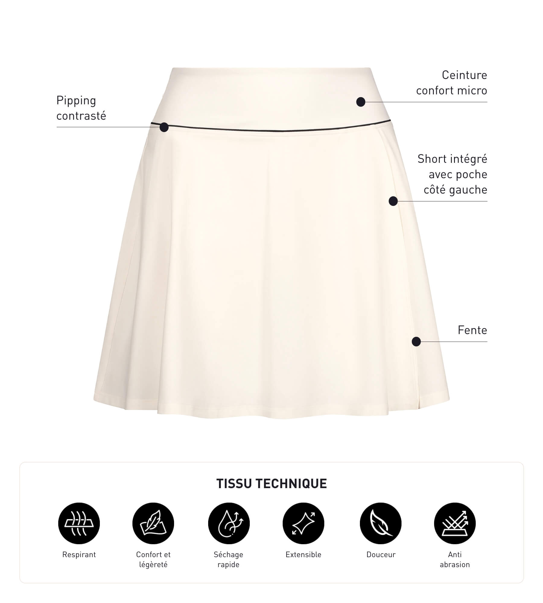 Approach your practice with ease and flair thanks to the Dim Move short skirt in ecru microfibre!