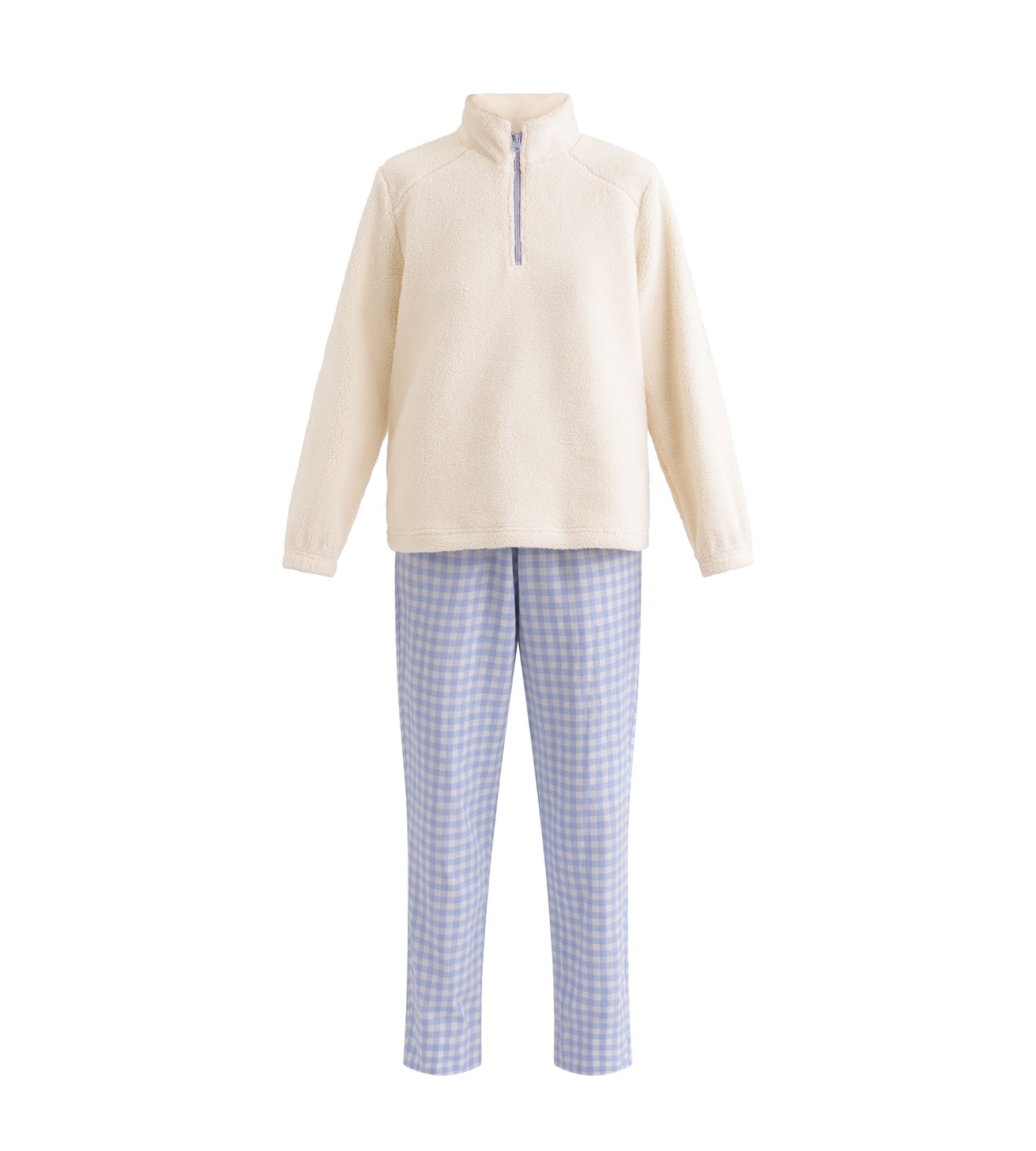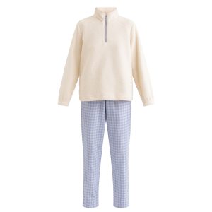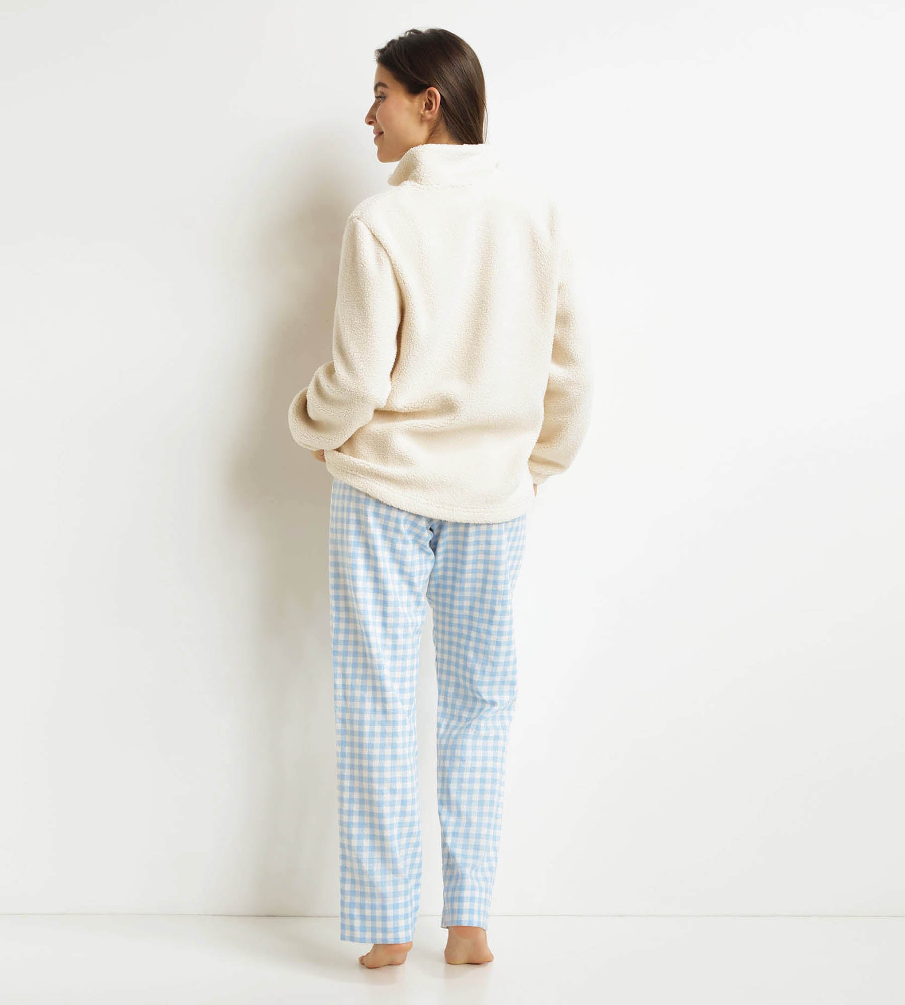 Adopt the Dim Warm women’s pyjama set in blue gingham flannel and grey fluffy top, for a cosy look that’s all about softness.