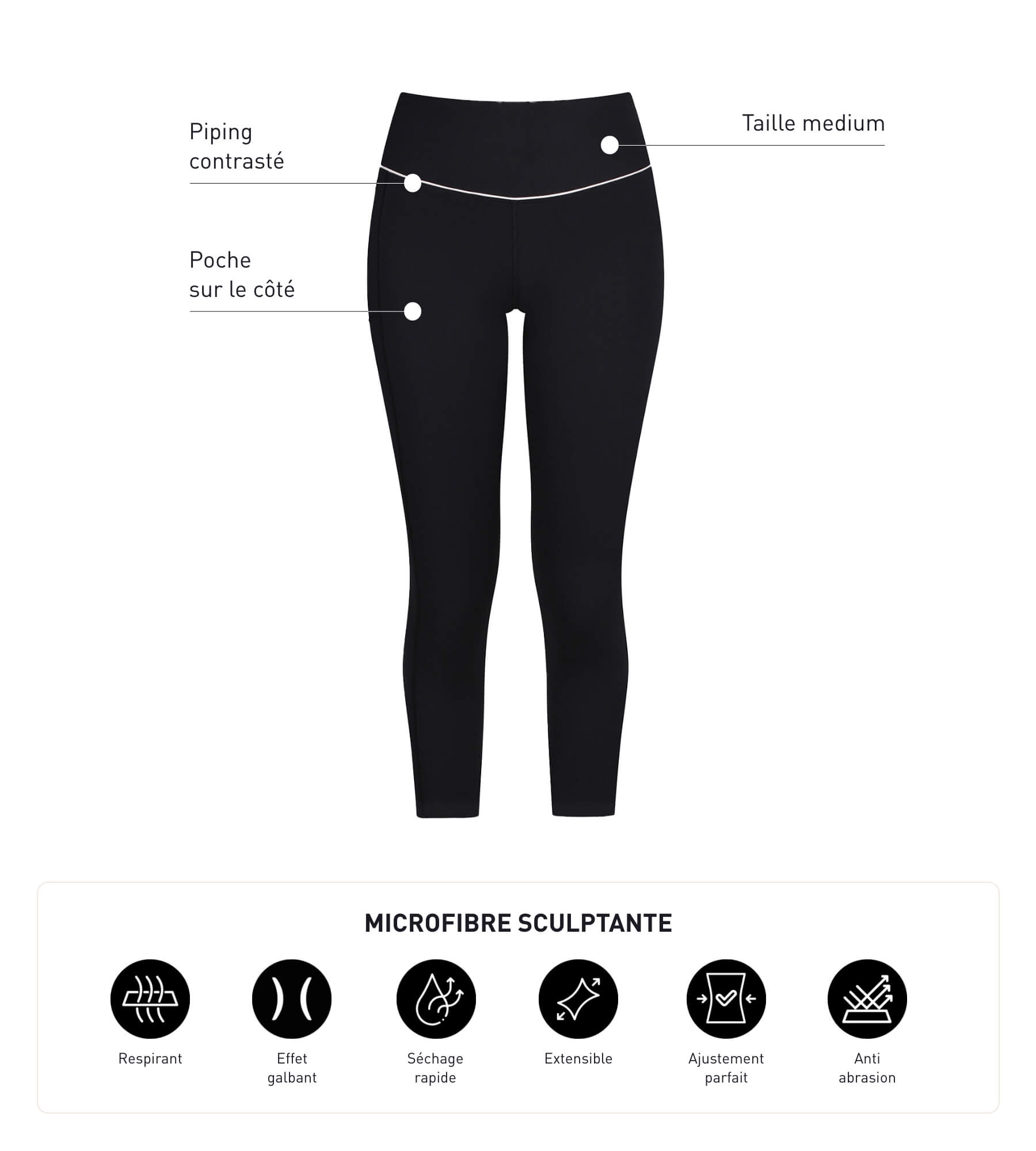 With its shorter leg length and medium size, the sport leggingsDim Move is perfect for all sports and all seasons! Its technical microfibre fabric sculpts your figure without restricting your movement, and dries quickly! You’ll love the minimalist style of these leggings, with their fine white piping that soberly emphasises the waistband, and their discreet side pocket.