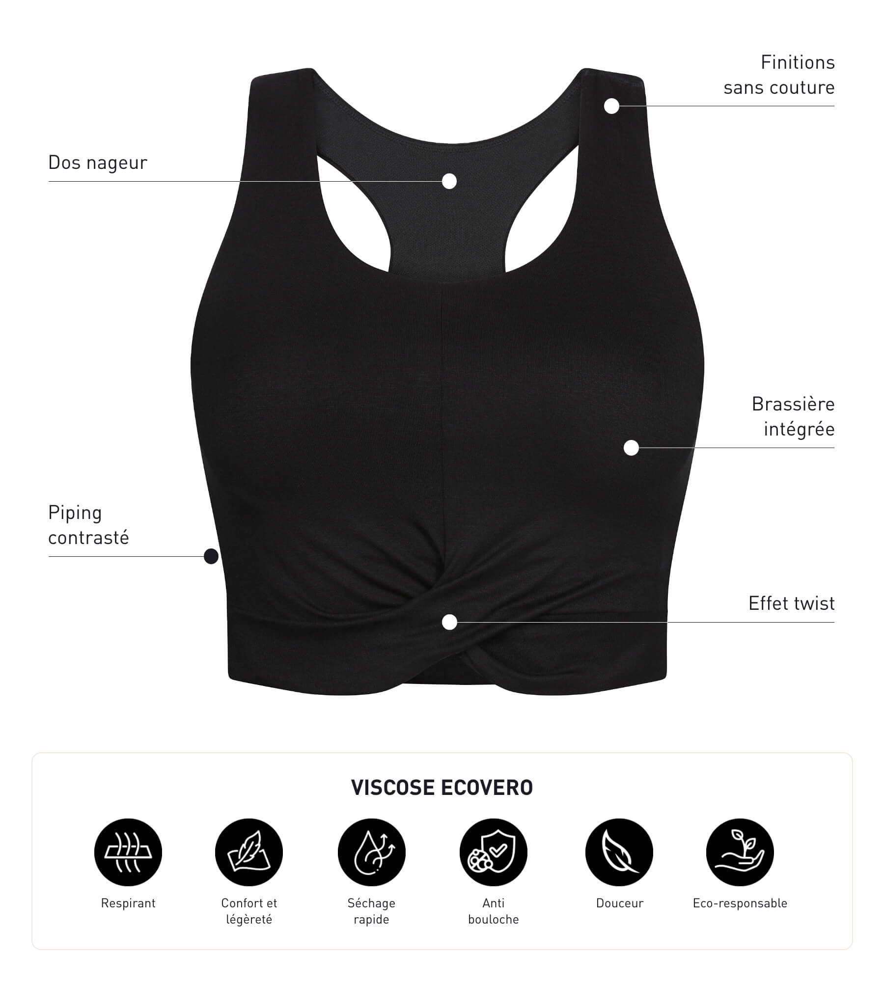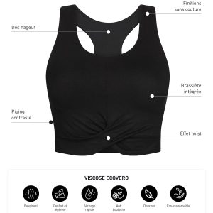 Catch this Dim Move 2-in-1 top, which combines the lightness of a tank top with the support of a brasports bra, with its fine integrated foams. Its eco-responsible viscose fabric is ultra-soft, quick-drying and pilling-free. Designed without seams and with a swimmer’s back, the women’s underwear top Dim Move follows your movements with comfort. We love the modern details of this sports top: a twisted effect on the front, and white piping that structures the sides.
